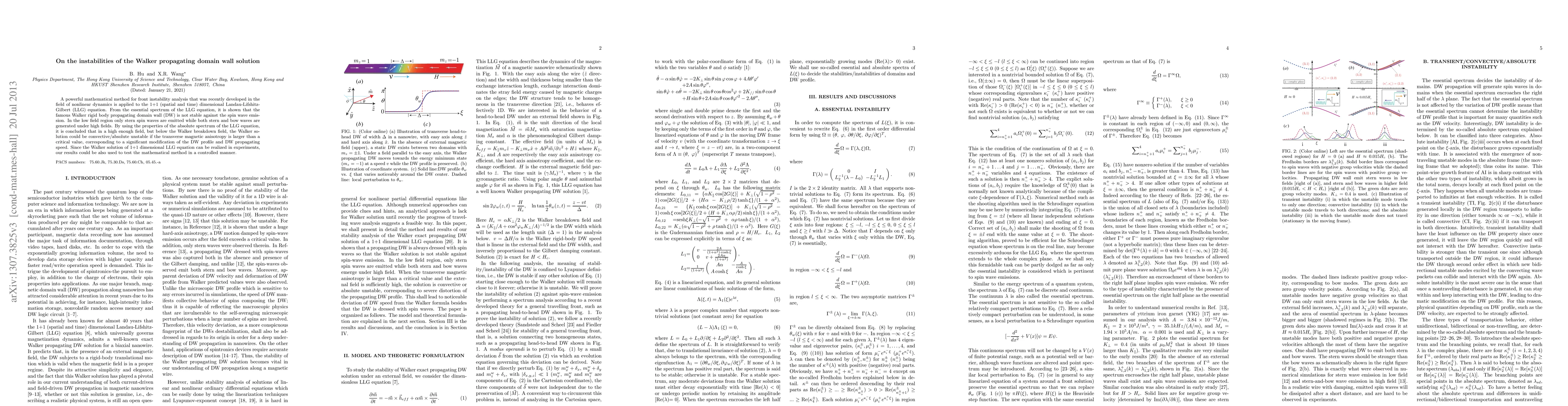 A powerful mathematical method for front instability analysis that was recently developed in the field of nonlinear dynamics is applied to the 1+1 (spatial and time) dimensional Landau-Lifshitz-Gilbert (LLG) equation. From the essential spectrum of the LLG equation, it is shown that the famous Walker rigid body propagating domain wall (DW) is not stable against the spin wave emission. In the low field region only stern spin waves are emitted while both stern and bow waves are generated under high fields. By using the properties of the absolute spectrum of the LLG equation, it is concluded that in a high enough field, but below the Walker breakdown field, the Walker solution could be convective/absolute unstable if the transverse magnetic anisotropy is larger than a critical value, corresponding to a significant modification of the DW profile and DW propagating speed. Since the Walker solution of 1+1 dimensional LLG equation can be realized in experiments, our results could be also used to test the mathematical method in a controlled manner.
