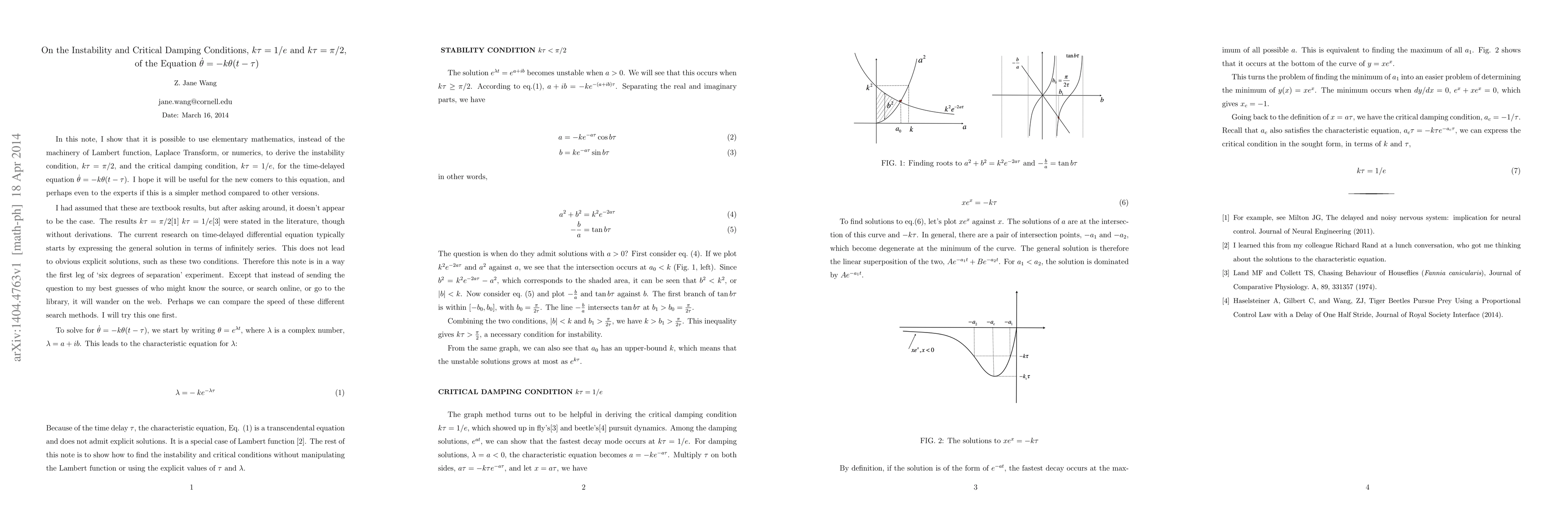 In this note, I show that it is possible to use elementary mathematics, instead of the machinery of Lambert function, Laplace Transform, or numerics, to derive the instability condition, $k \tau = \pi/2$, and the critical damping condition, $k\tau = 1/e$, for the time-delayed equation $\dot{\theta} = -k \theta(t-\tau)$. I hope it will be useful for the new comers to this equation, and perhaps even to the experts if this is a simpler method compared to other versions.