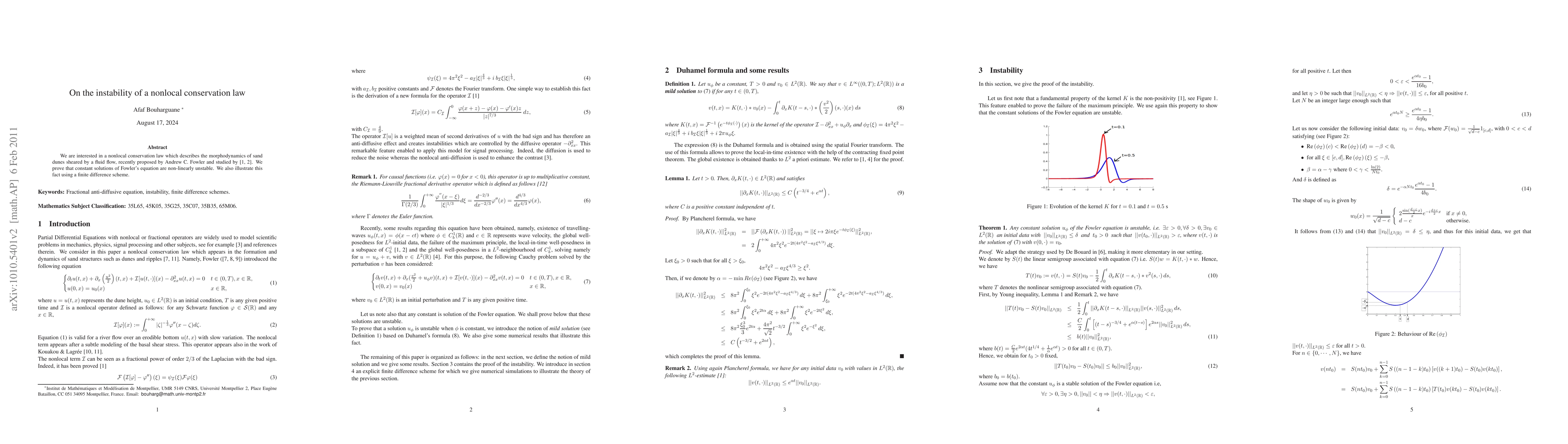 This paper investigates the instability of a nonlocal conservation law proposed by Andrew C. Fowler to model sand dune morphodynamics. The authors prove that constant solutions of Fowler's equation are nonlinearly unstable and demonstrate this instability through a finite difference scheme.