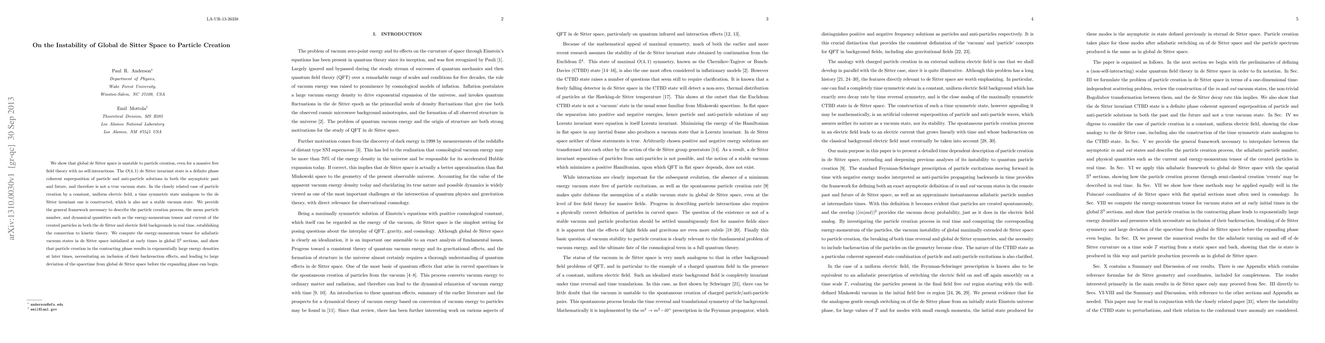 This paper demonstrates that global de Sitter space is unstable to particle creation, revealing that the invariant state is not a true vacuum but a superposition of particle and anti-particle solutions. It establishes a framework to describe the particle creation process and shows the significant backreaction effects of particle creation in the contracting phase, leading to deviations from de Sitter space before expansion.