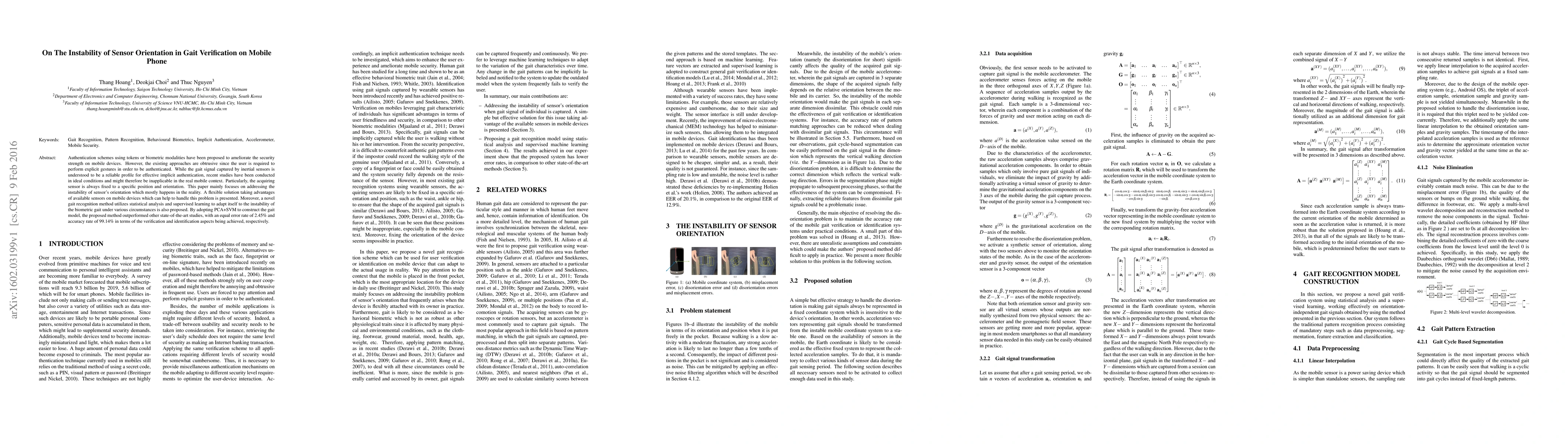 This paper proposes a flexible solution to address sensor orientation instability in gait verification on mobile phones, outperforming existing methods with an accuracy rate of 99.14%.