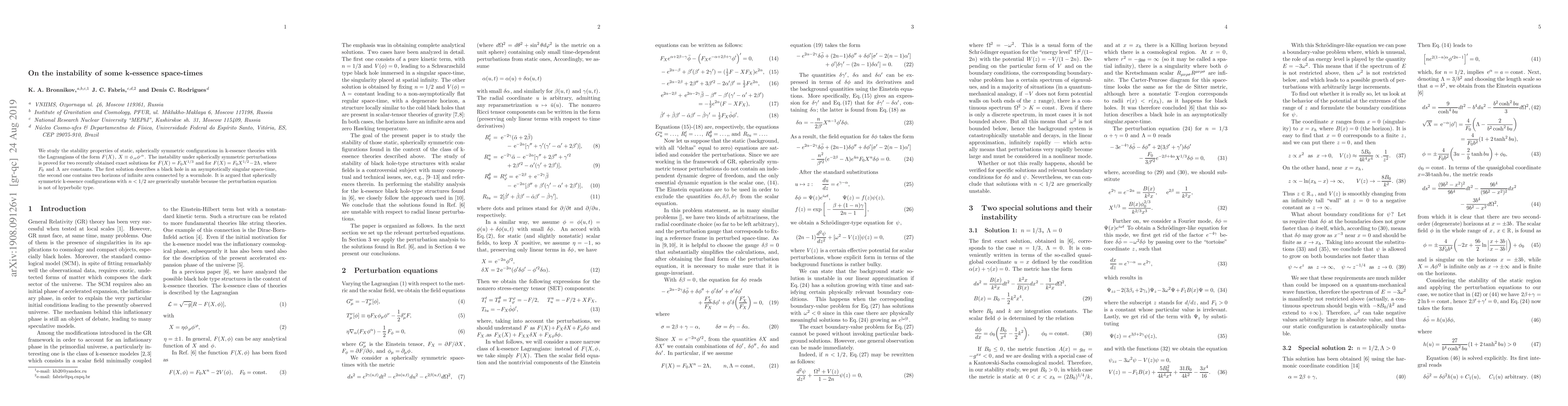 This paper investigates the instability of static, spherically symmetric k-essence configurations with specific Lagrangians, proving instability under perturbations for two exact solutions. It concludes that k-essence configurations with $n < 1/2$ are generally unstable due to non-hyperbolic perturbation equations.