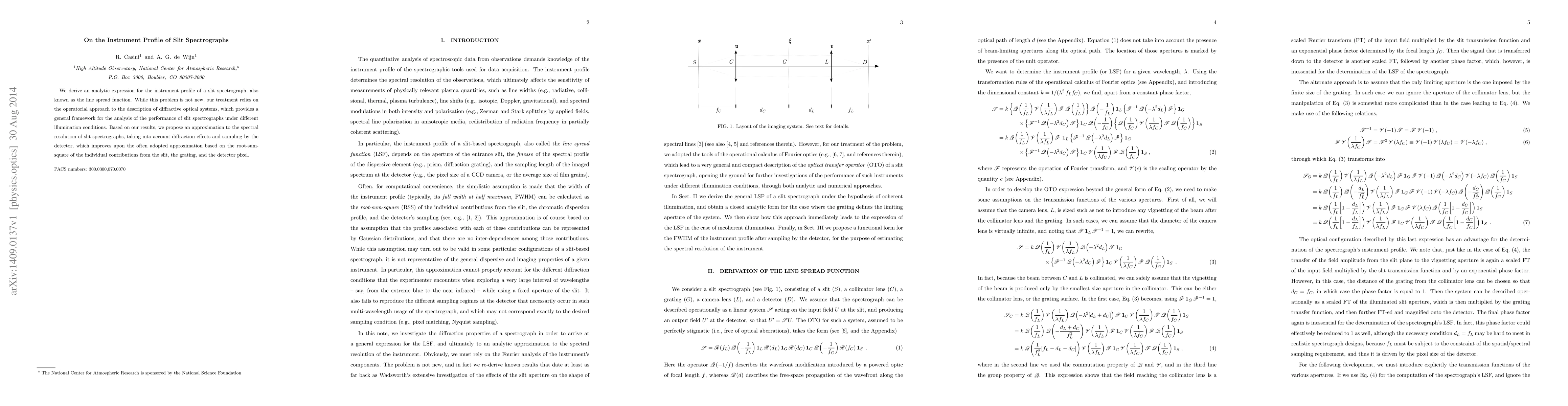 We derive an analytic expression for the instrument profile of a slit spectrograph, also known as the line spread function. While this problem is not new, our treatment relies on the operatorial approach to the description of diffractive optical systems, which provides a general framework for the analysis of the performance of slit spectrographs under different illumination conditions. Based on our results, we propose an approximation to the spectral resolution of slit spectrographs, taking into account diffraction effects and sampling by the detector, which improves upon the often adopted approximation based on the root-sumsquare of the individual contributions from the slit, the grating, and the detector pixel.