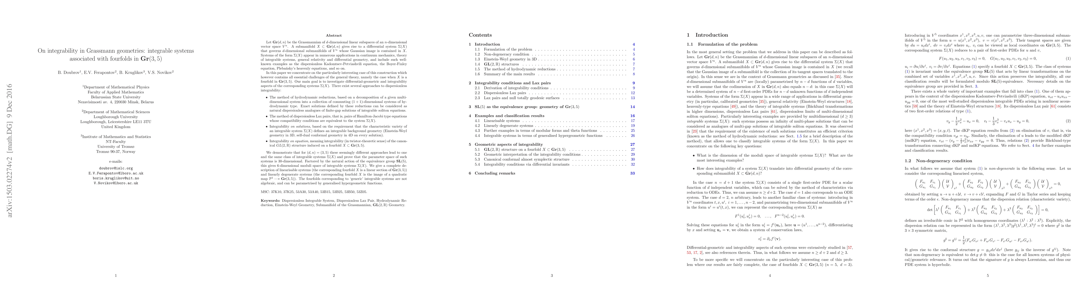 We investigate dispersionless integrable systems in 3D associated with fourfolds in the Grassmannian Gr(3,5). Such systems appear in numerous applications in continuum mechanics, general relativity and differential geometry, and include such well-known examples as the dispersionless Kadomtsev-Petviashvili equation, the Boyer-Finley equation, etc. We prove the equivalence of the four different approaches to integrability, revealing a remarkable correspondence with Einstein-Weyl geometry and the theory of GL(2,R) structures.