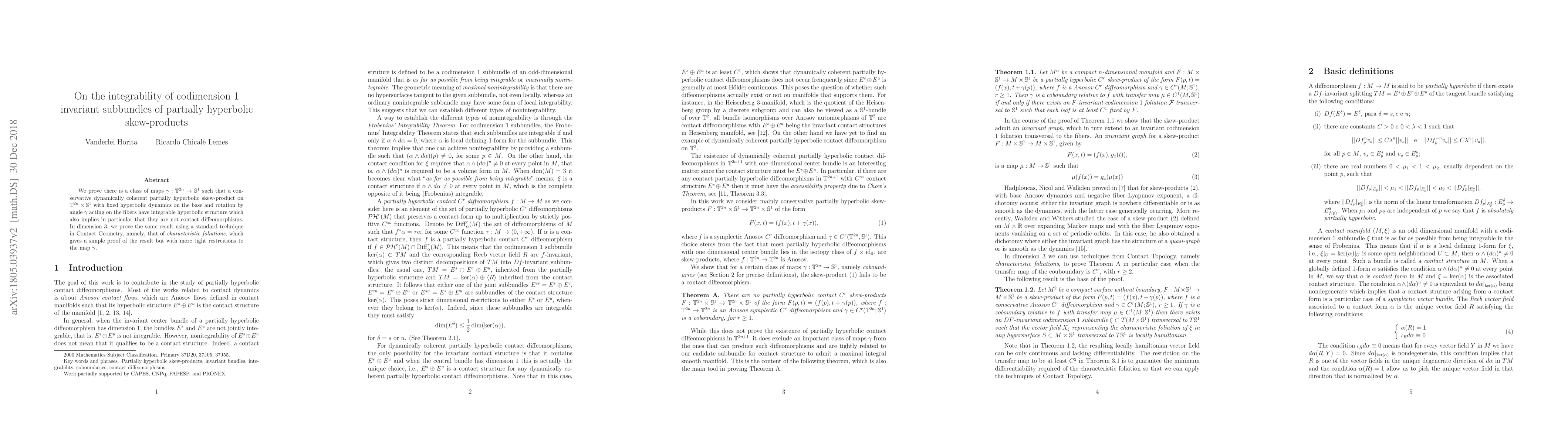 We prove there is a class of maps $\gamma:\mathbb{T}^{2n}\rightarrow\mathbb{S}^1$ such that a conservative dynamically coherent partially hyperbolic skew-product on $\mathbb{T}^{2n}\times\mathbb{S}^1$ with fixed hyperbolic dynamics on the base and rotation by angle $\gamma$ acting on the fibers have integrable hyperbolic structure which also implies in particular that they are not contact diffeomorphisms. In dimension $3$, we prove the same result using a standard technique in Contact Geometry, namely, that of \emph{characteristic foliations}, which gives a simple proof of the result but with more tight restrcitions to the map $\gamma$.