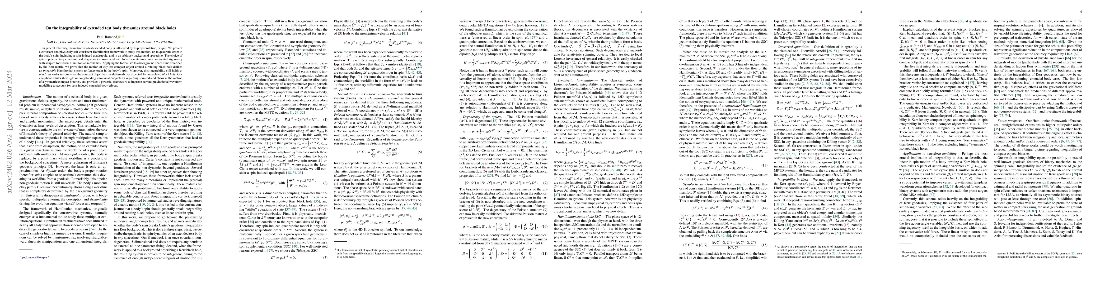 This paper develops a covariant Hamiltonian framework to analyze the motion of extended test bodies around rotating black holes, proving integrability up to quadratic order in the body's spin, which challenges prior numerical conjectures of spin-induced chaos and enhances gravitational waveform modeling.