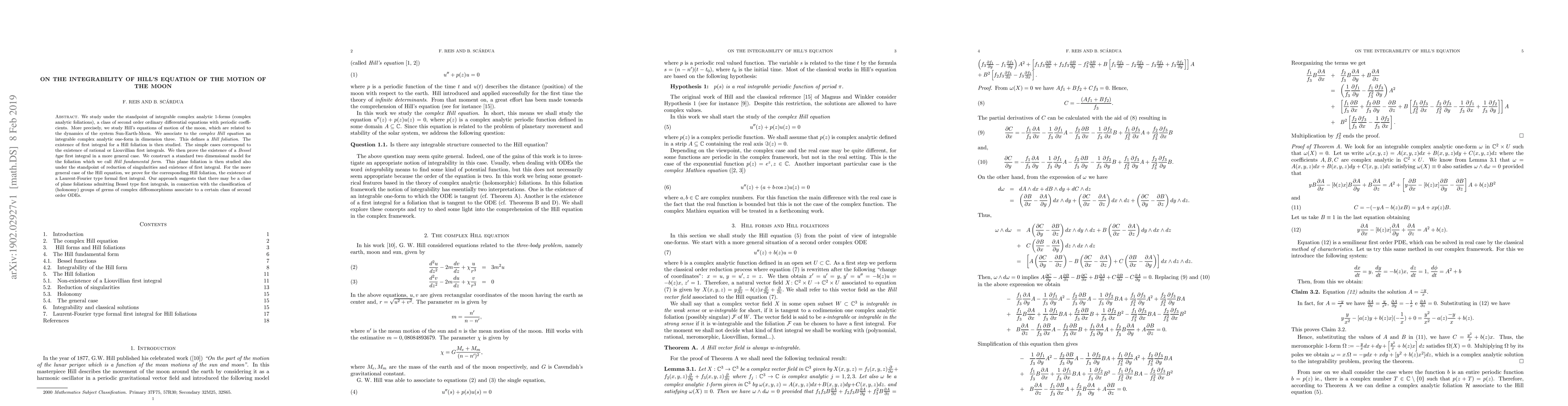 We study under the standpoint of integrable complex analytic 1-forms (complex analytic foliations), a class of second order ordinary differential equations with periodic coefficients. More precisely, we study Hill's equations of motion of the moon, which are related to the dynamics of the system Sun-Earth-Moon. We associate to the {\em complex Hill equation} an integrable complex analytic one-form in dimension three. This defines a {\it Hill foliation}. The existence of first integral for a Hill foliation is then studied. The simple cases correspond to the existence of rational or Liouvillian first integrals. We then prove the existence of a {\it Bessel type} first integral in a more general case. We construct a standard two dimensional model for the foliation which we call {\it Hill fundamental form}. This plane foliation is then studied also under the standpoint of reduction of singularities and existence of first integral. For the more general case of the Hill equation, we prove for the corresponding Hill foliation, the existence of a Laurent-Fourier type formal first integral. Our approach suggests that there may be a class of plane foliations admitting Bessel type first integrals, in connection with the classification of (holonomy) groups of germs of complex diffeomorphisms associate to a certain class of second order ODEs.