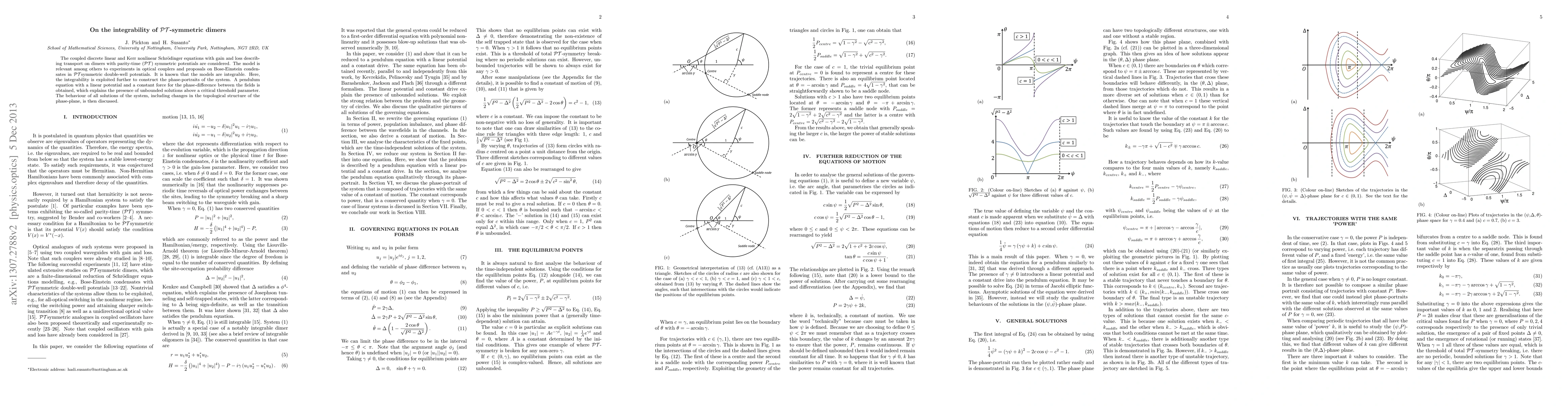 Researchers analyzed a PT-symmetric dimer model to understand its integrability, revealing a pendulum equation with unbounded solutions above a critical threshold and changes in the phase-plane's topological structure.