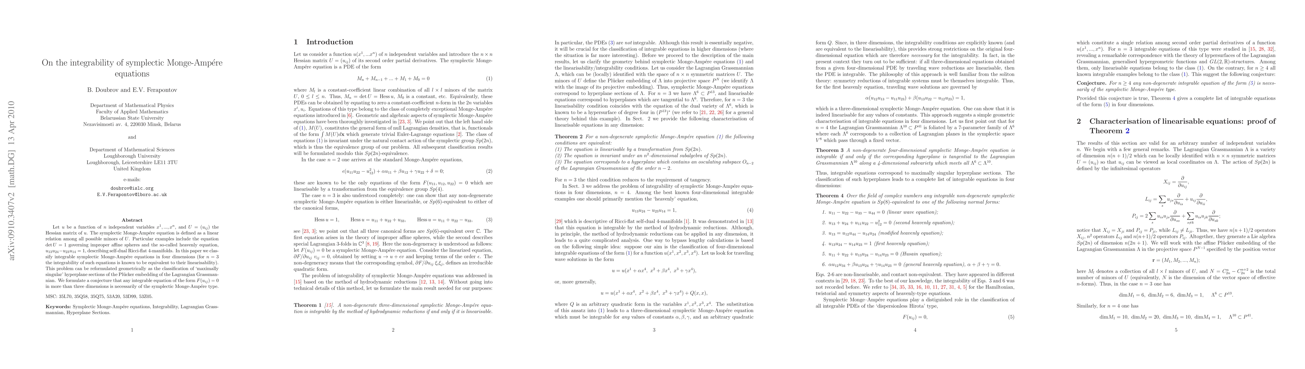 This paper classifies integrable symplectic Monge-Ampere equations in four dimensions, reformulating the problem geometrically in terms of maximally singular hyperplane sections of the Lagrangian Grassmannian. The authors propose a conjecture that any integrable equation in higher dimensions is of the symplectic Monge-Ampere type.