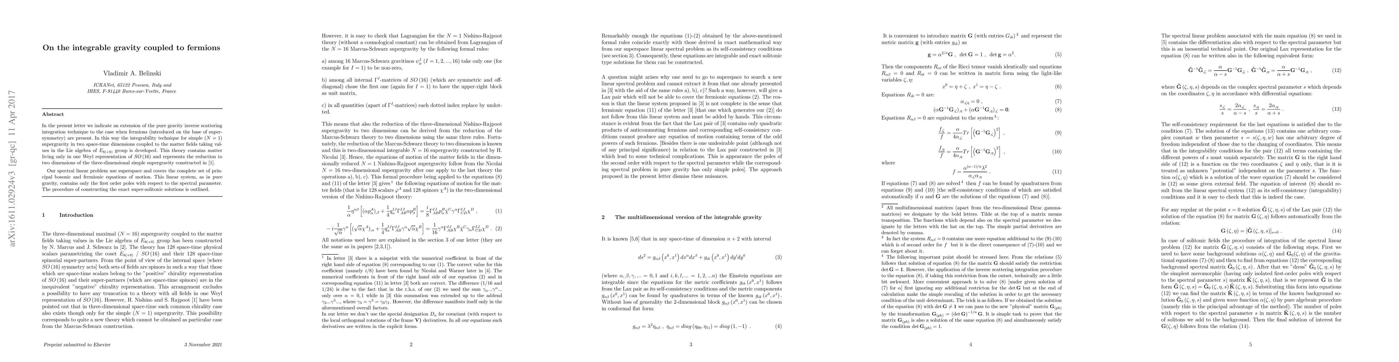 In the present letter we indicate an extension of the pure gravity inverse scattering integration technique to the case when fermions (introduced on the base of supersymmetry) are present. In this way the integrability technique for simple ($N=1$) supergravity in two space-time dimensions coupled to the matter fields taking values in the Lie algebra of $E_{8\left( +8\right) }$ group is developed. This theory contains matter living only in one Weyl representation of $SO\left( 16\right) $ and represents the reduction to two dimensions of the three-dimensional simple supergravity constructed in [1]. Our spectral linear problem use superspace and covers the complete set of principal bosonic and fermionic equations of motion. This linear system, as in pure gravity, contains only the first order poles with respect to the spectral parameter. The procedure of constructing the exact super-solitonic solutions is outlined.