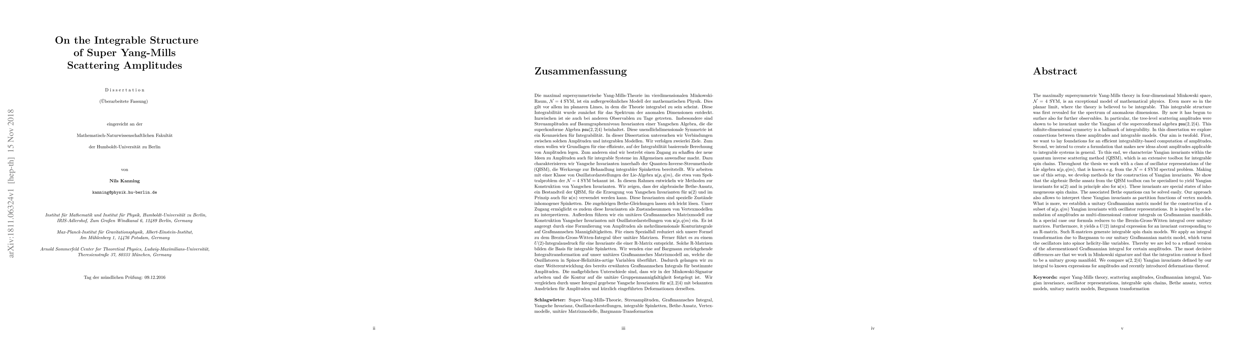 This research delves into the integrable structure of Super Yang-Mills scattering amplitudes, establishing connections to integrable models. It characterizes Yangian invariants within quantum inverse scattering methods and demonstrates their interpretation as partition functions of vertex models. The paper also introduces a unitary Grassmannian matrix model for constructing Yangian invariants, applying an integral transformation to derive a refined Graßmannian integral formula for certain amplitudes in Minkowski signature.