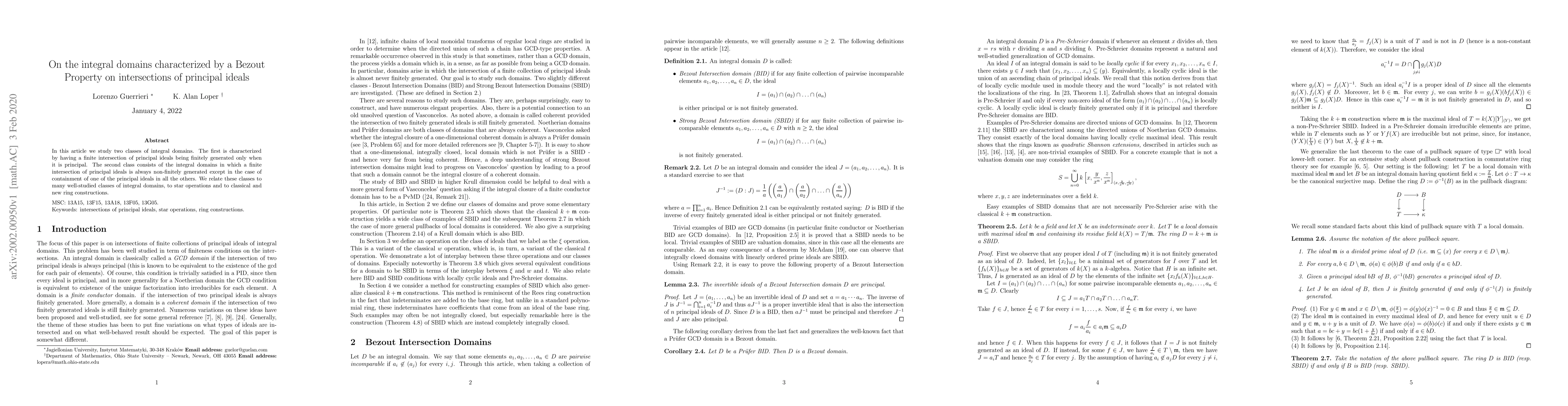 In this article we study two classes of integral domains. The first is characterized by having a finite intersection of principal ideals being finitely generated only when it is principal. The second class consists of the integral domains in which a finite intersection of principal ideals is always non-finitely generated except in the case of containment of one of the principal ideals in all the others. We relate these classes to many well-studied classes of integral domains, to star operations and to classical and new ring constructions.