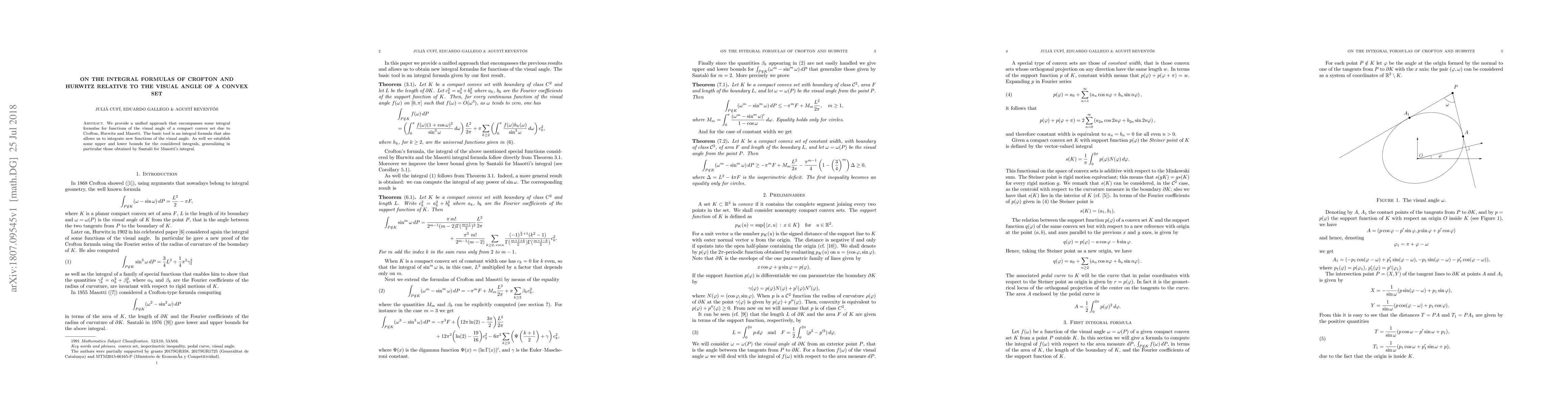 This paper unifies integral formulas from Crofton, Hurwitz, and Masotti for convex sets, introducing a new integral formula for visual angle functions and establishing upper and lower bounds, extending Santaló's work on Masotti's integral.