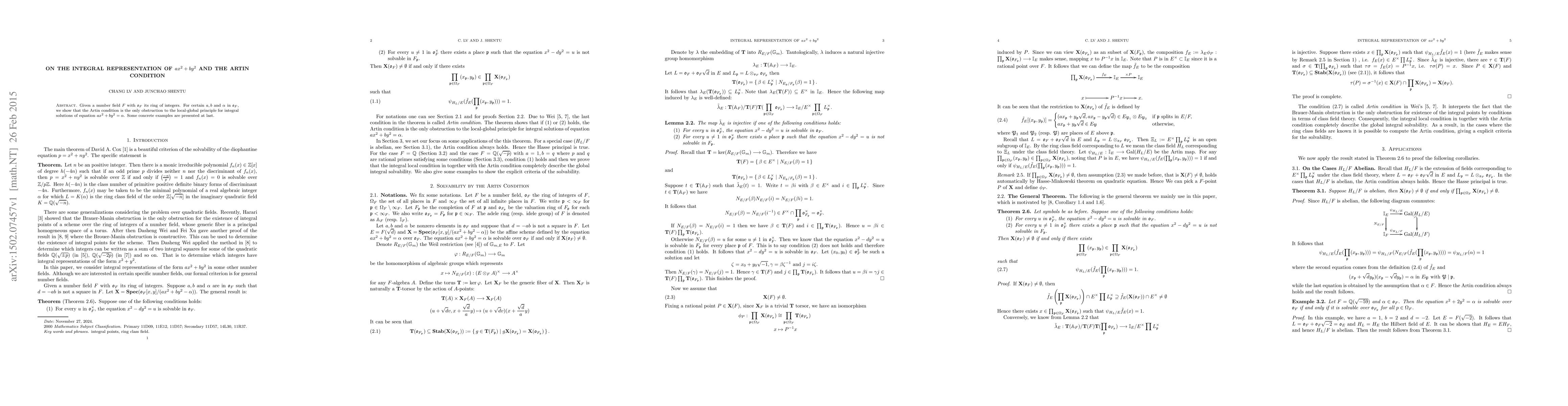 This research demonstrates that for specific $a, b$, and $alpha$ in the ring of integers of a number field $F$, the Artin condition is the sole hindrance to the local-global principle in finding integral solutions for the equation $ax^2+by^2=alpha$. The paper concludes with illustrative examples.