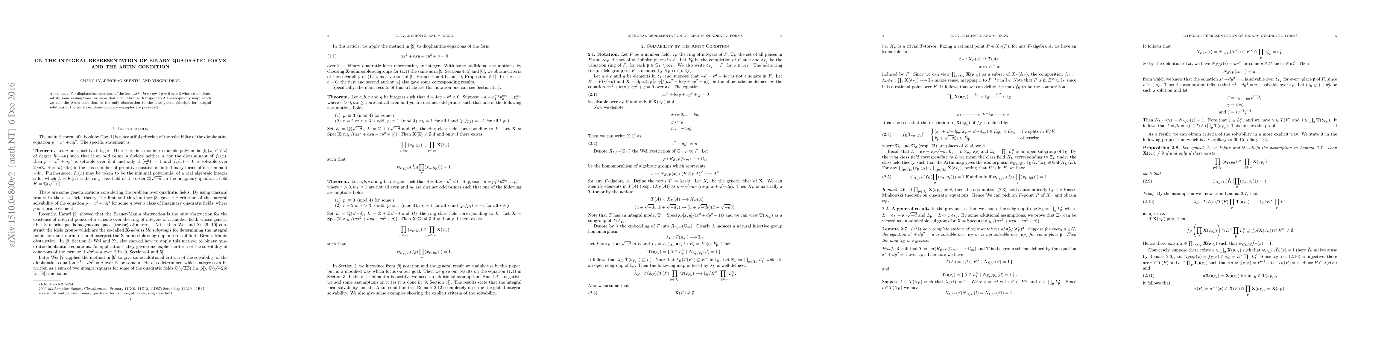 For diophantine equations of the form ax^2+bxy+cy^2+g=0 over Z whose coefficients satisfy some assumptions, we show that a condition with respect to Artin reciprocity map, which we call the Artin condition, is the only obstruction to the local-global principle for integral solutions of the equation. Some concrete examples are presented.