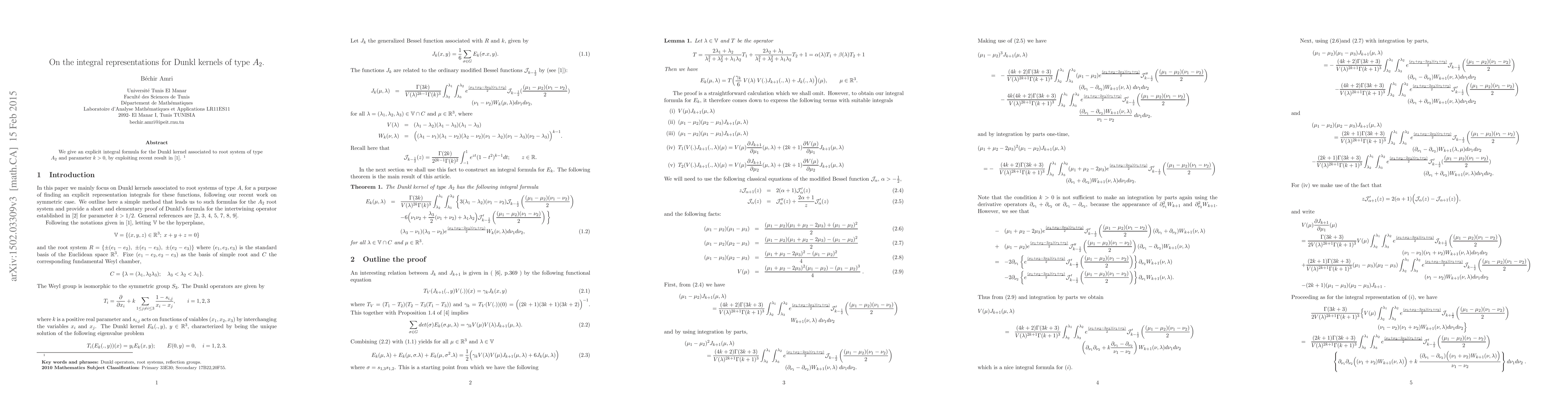 We give an explicit integral formula for the Dunkl kernel associated to root system of type $A_2$ and parameter $k>0$, by exploiting recent result in [1].