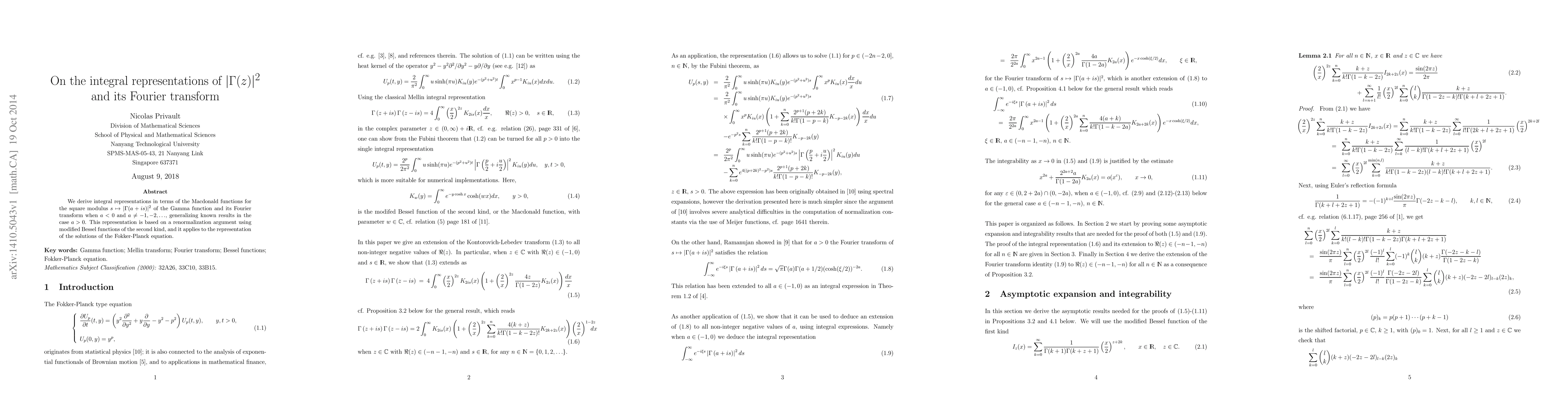 We derive integral representations in terms of the Macdonald functions for the square modulus $s\mapsto | \Gamma ( a + i s ) |^2$ of the Gamma function and its Fourier transform when $a<0$ and $a\not= -1,-2,\ldots $, generalizing known results in the case $a>0$. This representation is based on a renormalization argument using modified Bessel functions of the second kind, and it applies to the representation of the solutions of the Fokker-Planck equation.