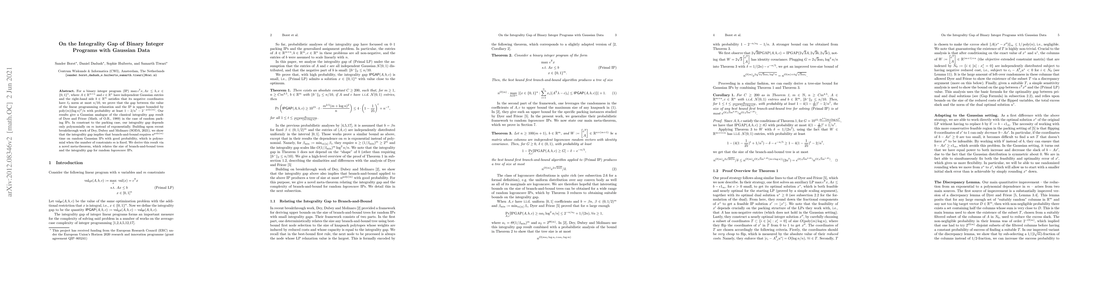 This paper establishes an upper bound on the integrality gap for binary integer programs with Gaussian data, showing it is polynomial in the number of constraints and logarithmic in the number of variables. It also demonstrates that this gap implies that branch-and-bound methods require polynomial time in the number of variables when the number of constraints is fixed.