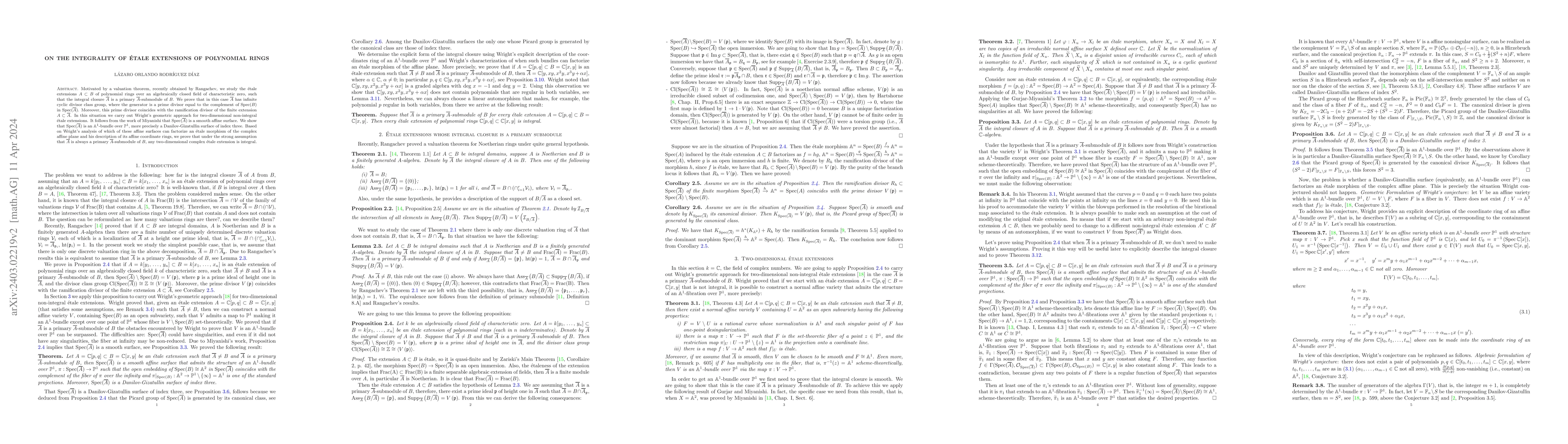 This paper studies \'etale extensions of polynomial rings over an algebraically closed field, proving that under certain conditions, the integral closure has an infinite cyclic divisor class group. It demonstrates that the Spec of the integral closure forms an $\mathbb{A}^{1}$-bundle over $\mathbb{P}^{1}$, specifically a Danilov-Gizatullin surface of index three, and concludes that any two-dimensional complex \'etale extension is integral under the specified assumptions.