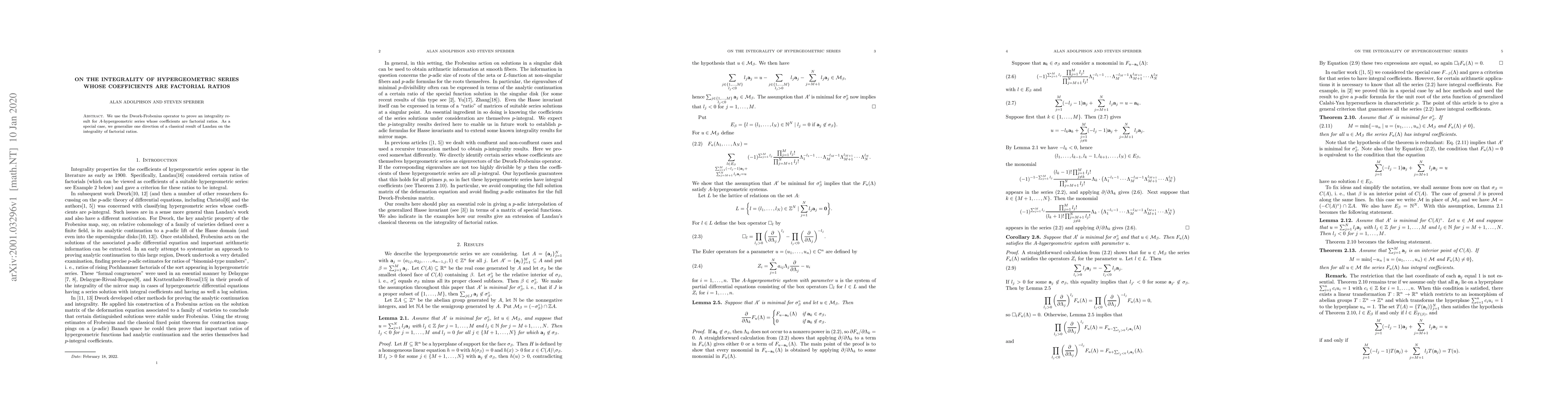Summary: The paper proves an integrality result for $A$-hypergeometric series using the Dwork-Frobenius operator, with coefficients being factorial ratios, and generalizes a classical result by Landau on the integrality of factorial ratios.