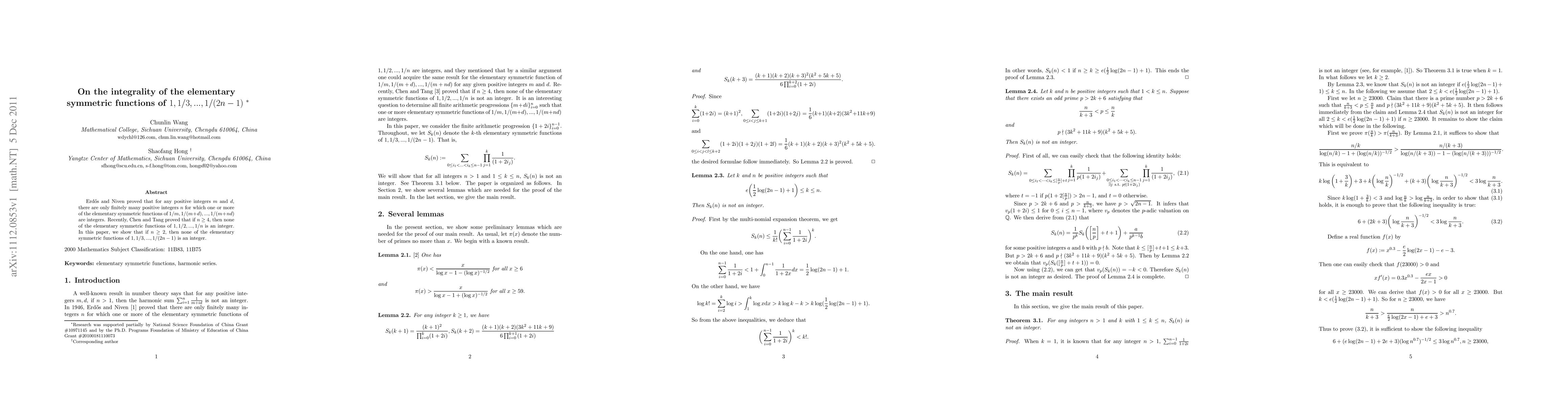 Erdos and Niven proved that for any positive integers $m$ and $d$, there are only finitely many positive integers $n$ for which one or more of the elementary symmetric functions of $1/m,1/(m+d), ..., 1/(m+nd)$ are integers. Recently, Chen and Tang proved that if $n\ge 4$, then none of the elementary symmetric functions of $1,1/2, ..., 1/n$ is an integer. In this paper, we show that if $n\ge 2$, then none of the elementary symmetric functions of $1, 1/3, ..., 1/(2n-1)$ is an integer.