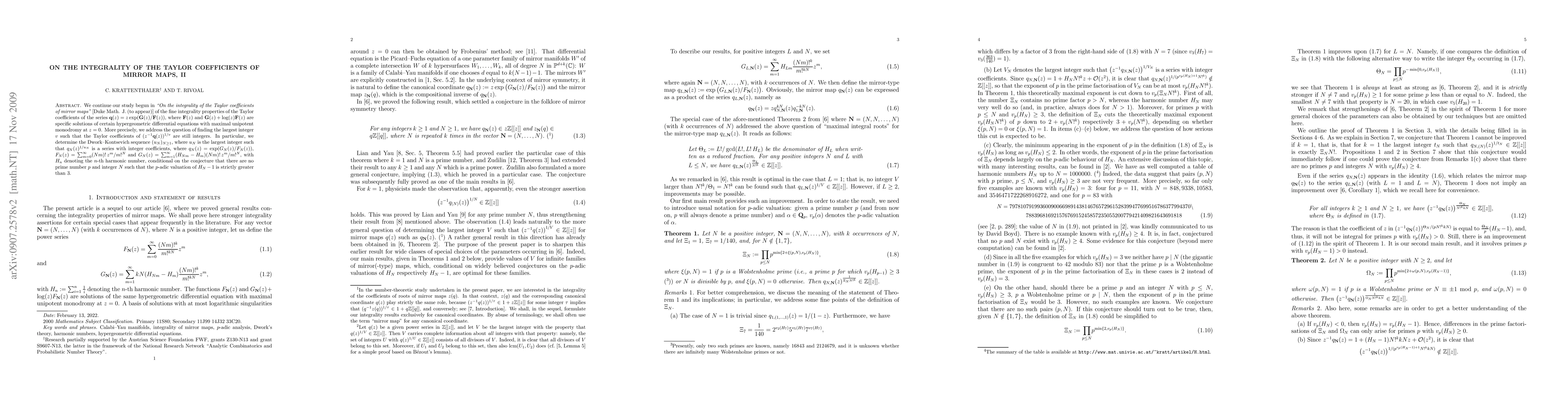 Researchers investigate the integrality of Taylor coefficients of mirror maps, focusing on finding the largest integer v such that certain series with z^{-1}q(z)^{1/v} have integer coefficients.