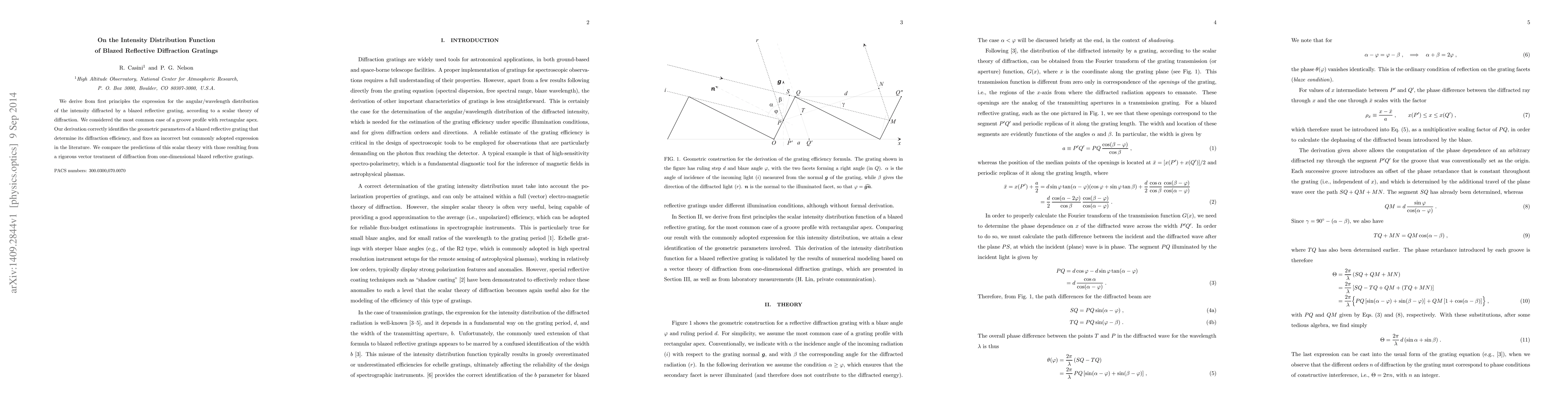 This paper derives the intensity distribution function for a blazed reflective grating using scalar diffraction theory, correcting a prevalent error in existing literature. It compares these findings with results from a rigorous vector diffraction treatment.