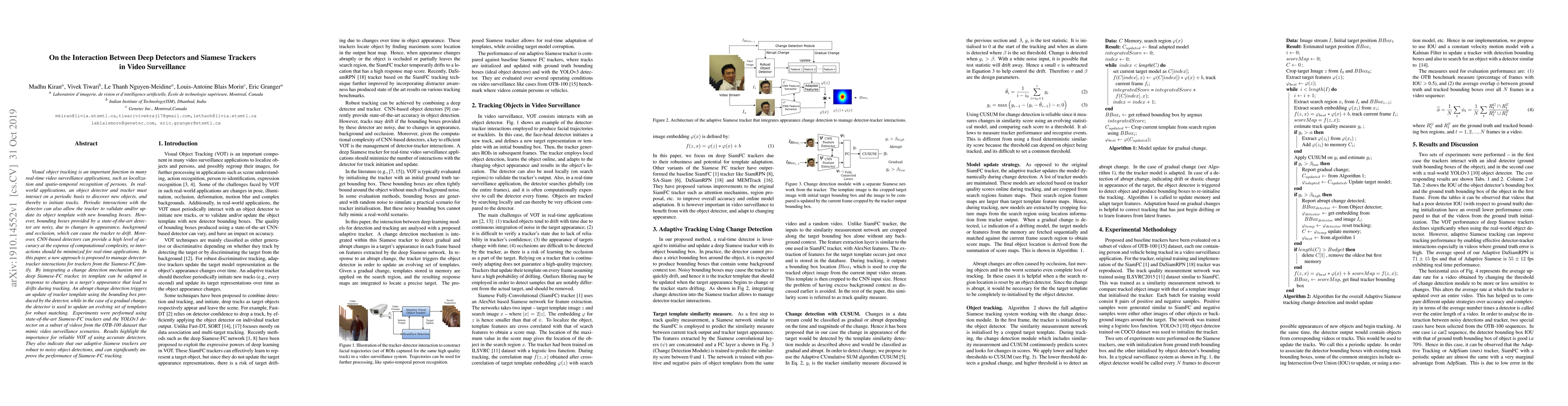 This paper proposes a method to manage detector-tracker interactions in video surveillance, integrating a change detection mechanism into a Siamese-FC tracker to adapt its template based on detections. Experiments show that adaptive Siamese trackers can improve tracking performance despite noisy detections.