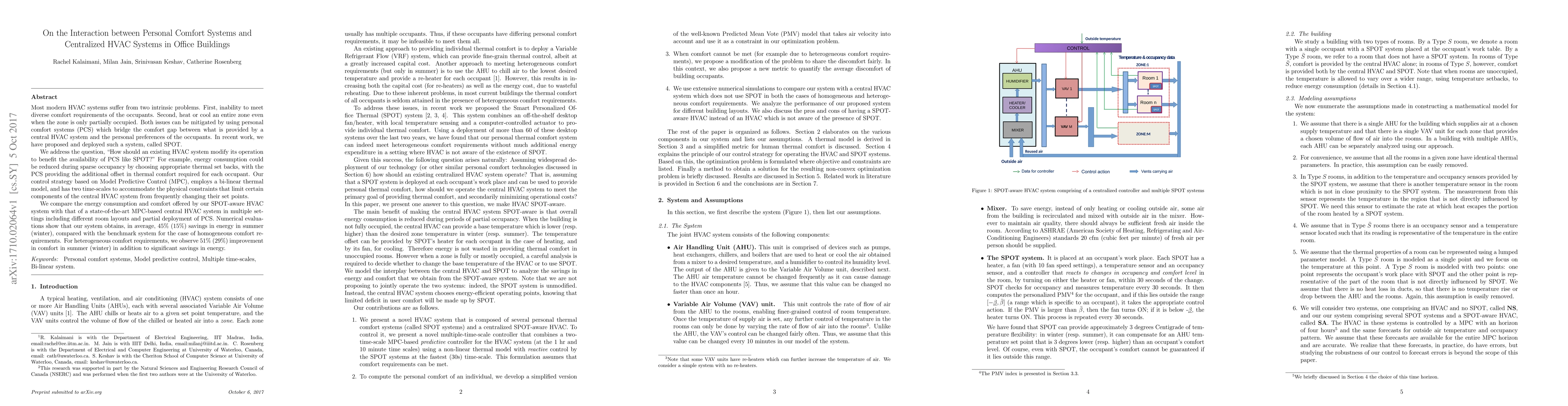 Most modern HVAC systems suffer from two intrinsic problems. First, inability to meet diverse comfort requirements of the occupants. Second, heat or cool an entire zone even when the zone is only partially occupied. Both issues can be mitigated by using personal comfort systems (PCS) which bridge the comfort gap between what is provided by a central HVAC system and the personal preferences of the occupants. In recent work, we have proposed and deployed such a system, called SPOT. We address the question, "How should an existing HVAC system modify its operation to benefit the availability of PCS like SPOT?" For example, energy consumption could be reduced during sparse occupancy by choosing appropriate thermal set backs, with the PCS providing the additional offset in thermal comfort required for each occupant. Our control strategy based on Model Predictive Control (MPC), employs a bi-linear thermal model, and has two time-scales to accommodate the physical constraints that limit certain components of the central HVAC system from frequently changing their set points. We compare the energy consumption and comfort offered by our SPOT-aware HVAC system with that of a state-of-the-art MPC-based central HVAC system in multiple settings including different room layouts and partial deployment of PCS. Numerical evaluations show that our system obtains, in average, 45% (15%) savings in energy in summer (winter), compared with the benchmark system for the case of homogeneous comfort requirements. For heterogeneous comfort requirements, we observe 51% (29%) improvement in comfort in summer (winter) in addition to significant savings in energy.