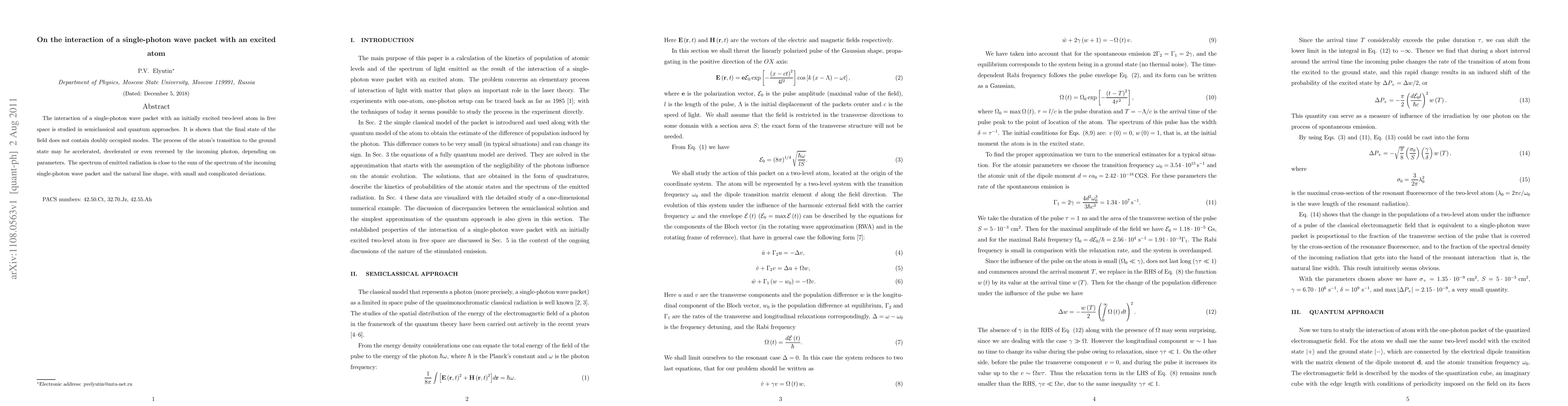 This paper investigates the interaction between a single-photon wave packet and an initially excited two-level atom, revealing that the final field state avoids doubly occupied modes. The study shows that the atom's transition to the ground state can be manipulated—accelerated, decelerated, or reversed—depending on specific parameters, with emitted radiation's spectrum closely resembling the sum of the incoming photon's spectrum and the natural line shape.