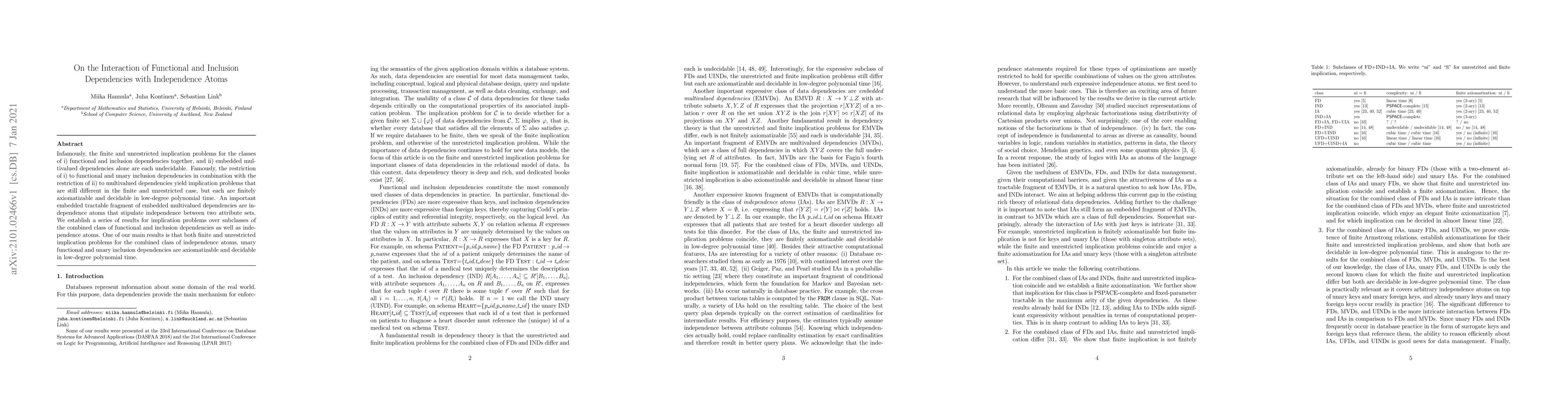 This paper investigates the interaction between functional and inclusion dependencies with independence atoms, demonstrating that implication problems involving these elements are finitely axiomatizable and decidable in low-degree polynomial time, even when unrestricted. The study highlights the tractability of a combined class including unary functional and inclusion dependencies alongside independence atoms.
