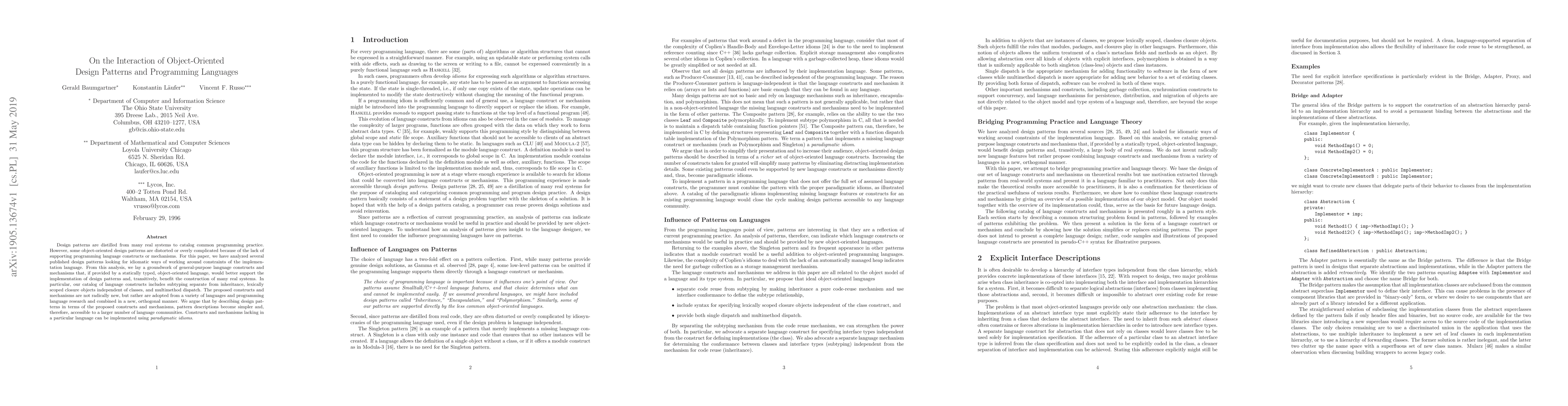 This paper analyzes how object-oriented design patterns can be distorted by language constraints and proposes general-purpose language constructs like subtyping, lexically scoped closures, and multimethod dispatch to better support pattern implementation. It argues these constructs simplify pattern descriptions and enhance accessibility.
