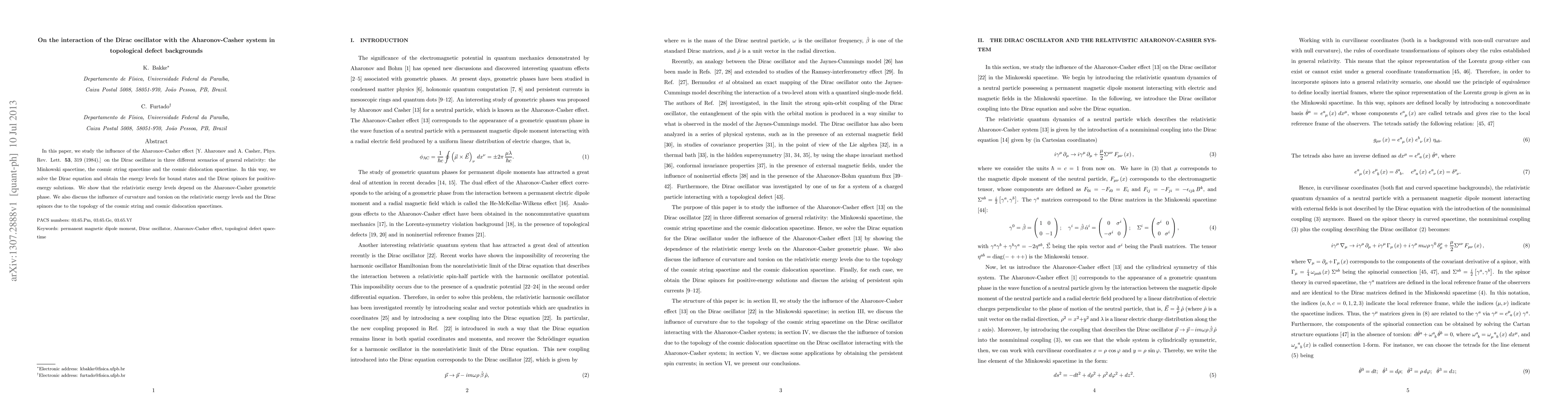 This paper investigates the Dirac oscillator's interaction with the Aharonov-Casher effect in Minkowski, cosmic string, and cosmic dislocation spacetimes, revealing that relativistic energy levels are influenced by the Aharonov-Casher geometric phase, with additional effects from spacetime curvature and torsion.
