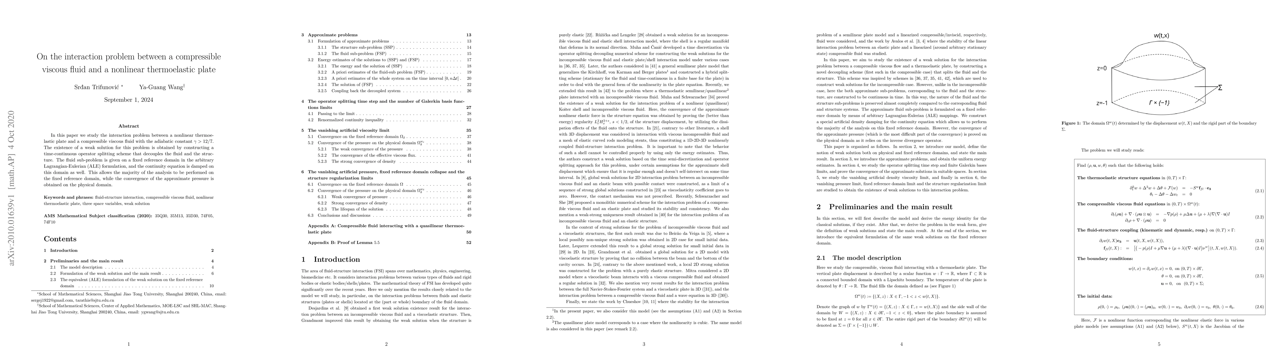 The paper introduces a novel operator splitting scheme for decoupling the fluid and structure sub-problems in the context of compressible viscous fluids interacting with nonlinear thermoelastic plates, facilitating the analysis and providing a pathway for weak solution existence.