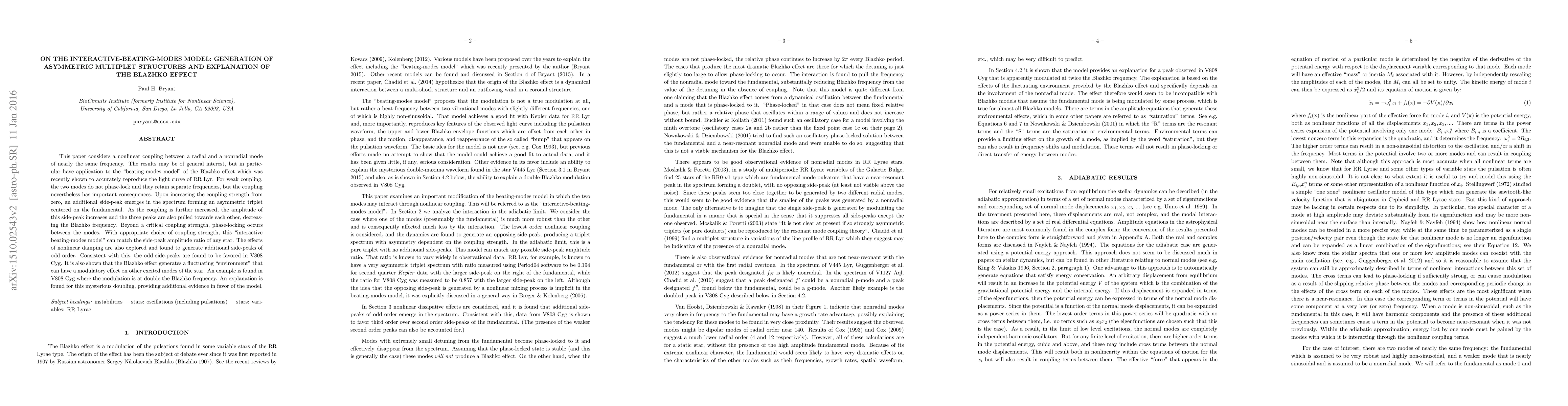 This paper considers a nonlinear coupling between a radial and a nonradial mode of nearly the same frequency. The results may be of general interest, but in particular have application to the "beating-modes model" of the Blazhko effect which was recently shown to accurately reproduce the light curve of RR Lyr. For weak coupling, the two modes do not phase-lock and they retain separate frequencies, but the coupling nevertheless has important consequences. Upon increasing the coupling strength from zero, an additional side-peak emerges in the spectrum forming an asymmetric triplet centered on the fundamental. As the coupling is further increased, the amplitude of this side-peak increases and the three peaks are also pulled towards each other, decreasing the Blazhko frequency. Beyond a critical coupling strength, phase-locking occurs between the modes. With appropriate choice of coupling strength, this "interactive beating-modes model" can match the side-peak amplitude ratio of any star. The effects of nonlinear damping are also explored and found to generate additional side-peaks of odd order. Consistent with this, the odd side-peaks are found to be favored in V808 Cyg. It is also shown that the Blazhko effect generates a fluctuating "environment" that can have a modulatory effect on other excited modes of the star. An example is found in V808 Cyg where the modulation is at double the Blazhko frequency. An explanation is found for this mysterious doubling, providing additional evidence in favor of the model.