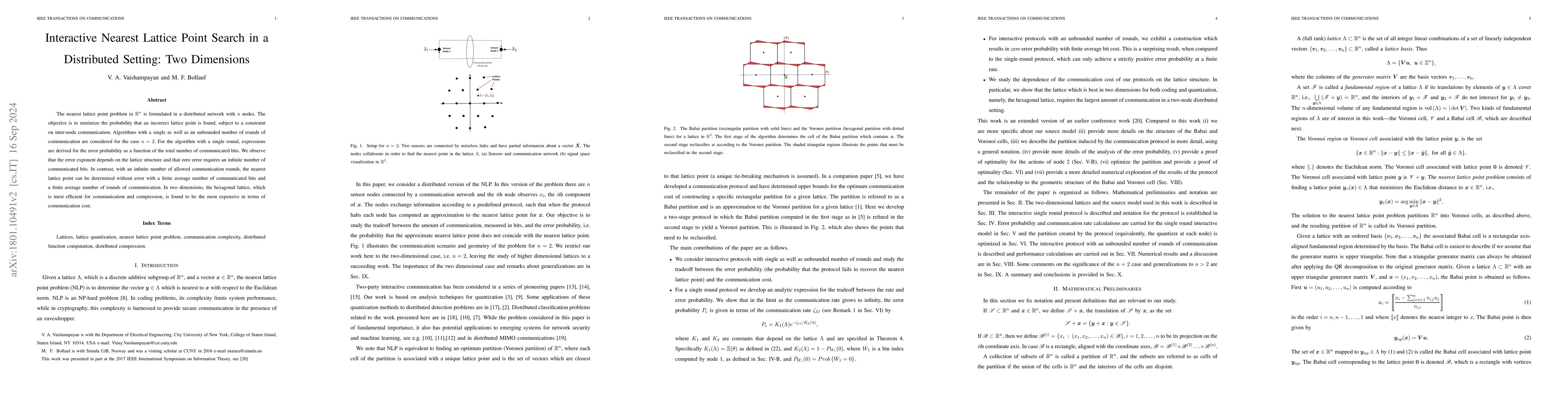 Researchers studied the cost of communication in a distributed algorithm to find the nearest lattice point in 2D space, finding that error probability decreases with total communicated bits and average cost is finite over infinite rounds.