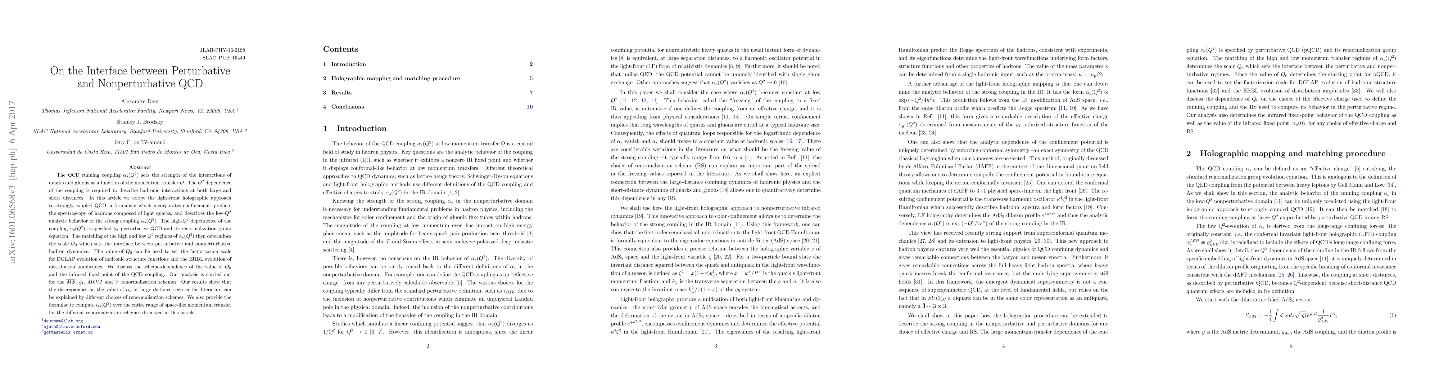 This paper explores the interface between perturbative and nonperturbative QCD using the light-front holographic approach, determining the scale $Q_0$ that separates these regimes. It discusses the scheme-dependence of $Q_0$ and provides formulae for $\alpha_s(Q^2)$ across different renormalization schemes, explaining discrepancies in $\alpha_s$ values due to scheme choices.
