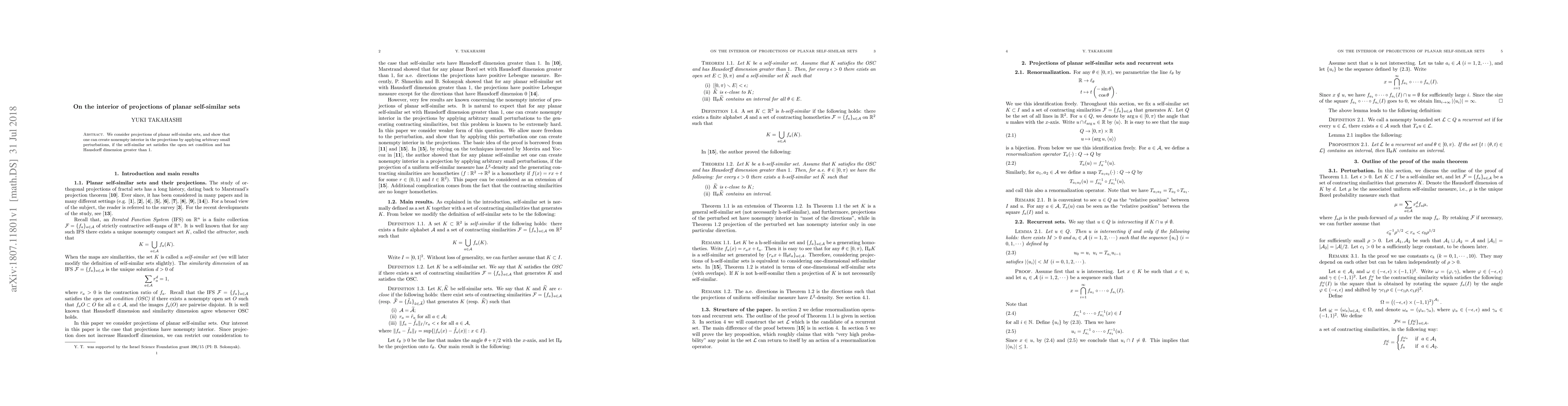 Summary: The paper demonstrates that minor perturbations can generate nonempty interiors in projections of planar self-similar sets, provided the set meets the open set condition and has a Hausdorff dimension exceeding 1. This reveals a surprising structural flexibility in such projections.