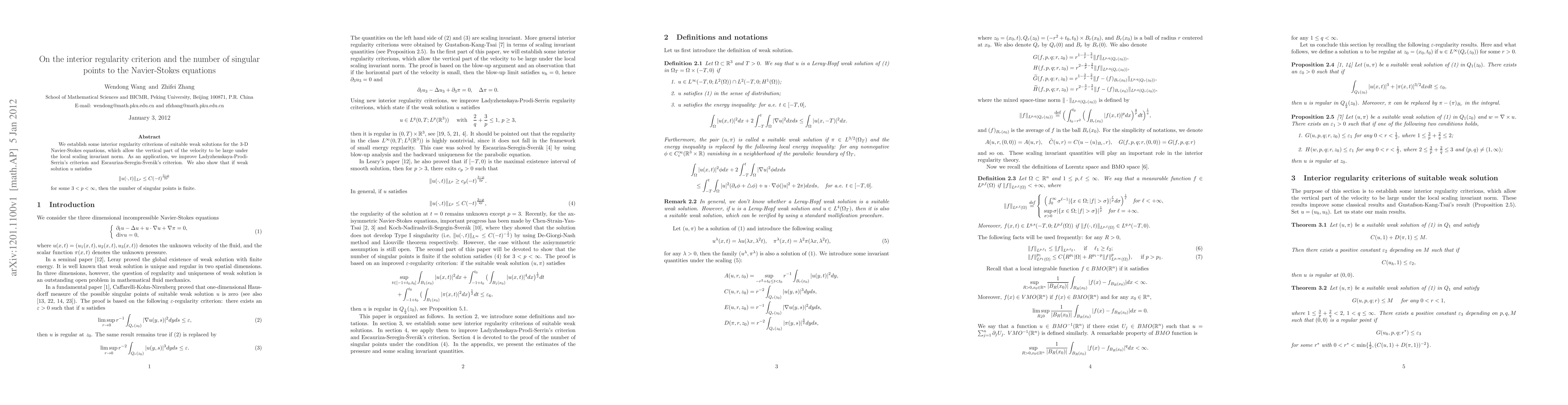 This paper establishes new interior regularity criteria for 3-D Navier-Stokes equations, improving existing criteria and showing that weak solutions with specific decay rates have a finite number of singular points.