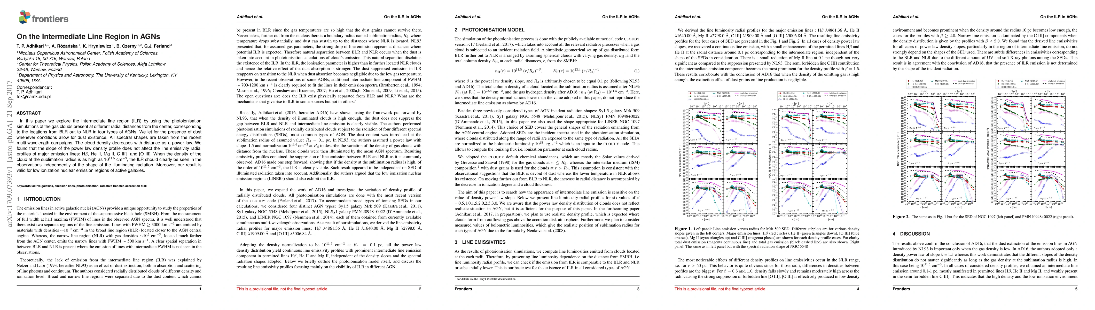 In this paper we explore the intermediate line region (ILR) by using the photoionisation simulations of the gas clouds present at different radial distances from the center, corresponding to the locations from BLR out to NLR in four types of AGNs. We let for the presence of dust whenever conditions allow for dust existence. All spectral shapes are taken from the recent multi-wavelength campaigns. The cloud density decreases with distance as a power law. We found that the slope of the power law density profile does not affect the line emissivity radial profiles of major emission lines: H${\beta}$, He~II, Mg~II, C~III] ~and [O~III]. When the density of the cloud at the sublimation radius is as high as 10$^{11.5}$ cm$^{-3}$, the ILR should clearly be seen in the observations independently of the shape of the illuminating radiation. Moreover, our result is valid for low ionization nuclear emission regions of active galaxies.