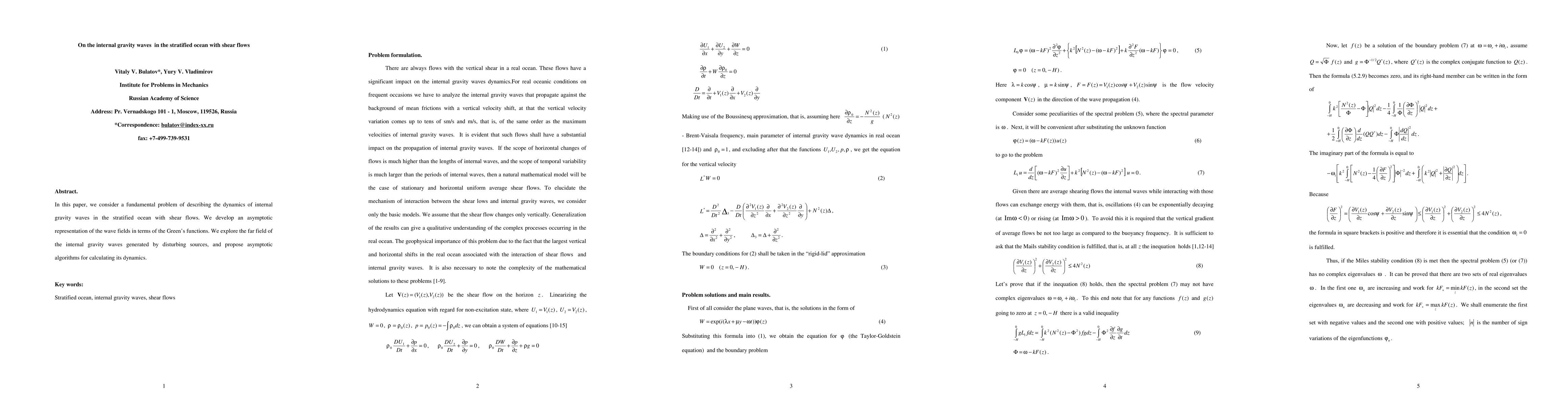 This paper develops an asymptotic representation of internal gravity waves in a stratified ocean with shear flows using Green's functions, and proposes algorithms to calculate the dynamics of the far field generated by disturbing sources.