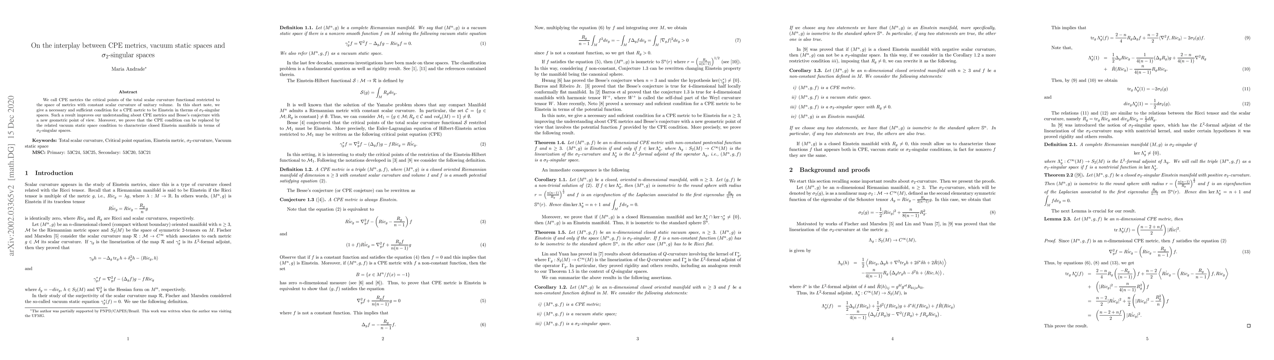 We call CPE metrics the critical points of the total scalar curvature functional restricted to the space of metrics with constant scalar curvature of unitary volume. In this short note, we give a necessary and sufficient condition for a CPE metric to be Einstein in therms of $\sigma_2$-singular spaces. Such a result improves our understanding about CPE metrics and Besse's conjecture with a new geometric point of view. Moreover, we prove that the CPE condition can be replaced by the related vacuum static space condition to characterize closed Einstein manifolds in terms of $\sigma_2$-singular spaces.