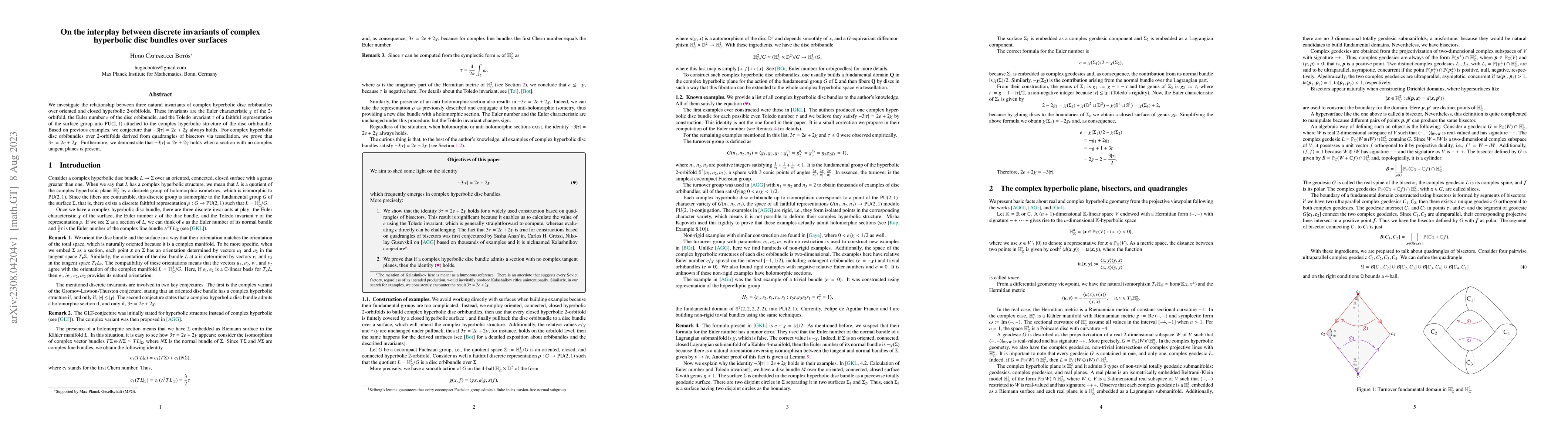 This paper explores the relationships between Euler characteristic, Euler number, and Toledo invariant in complex hyperbolic disc orbibundles over hyperbolic 2-orbifolds, proving a conjectured formula $-3|\tau| = 2e+2\chi$ for specific cases and demonstrating its validity under certain conditions.