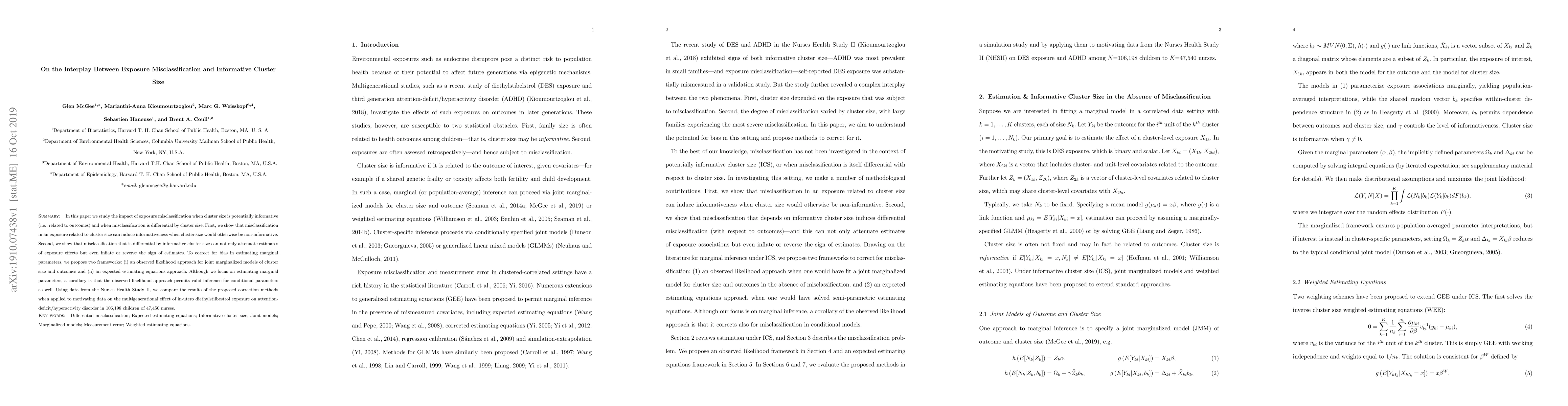 This study examines how exposure misclassification affects clustering of outcomes and proposes two correction methods to estimate marginal parameters accurately.