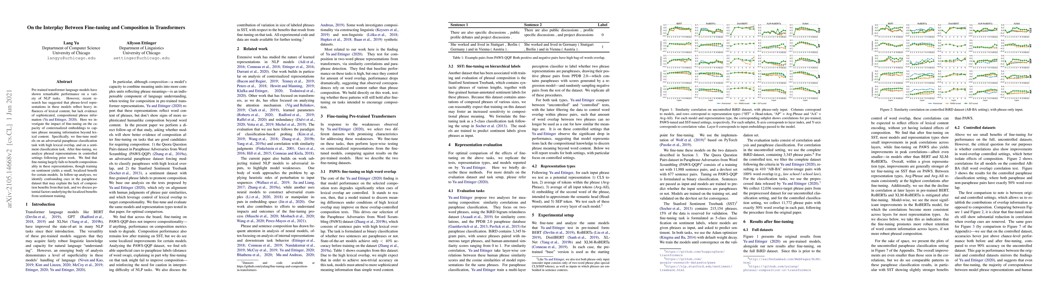 Fine-tuning transformer language models on paraphrase and sentiment classification tasks does not significantly improve their ability to capture phrase-level meaning beyond lexical content. However, sentiment training shows localized benefits for certain models.