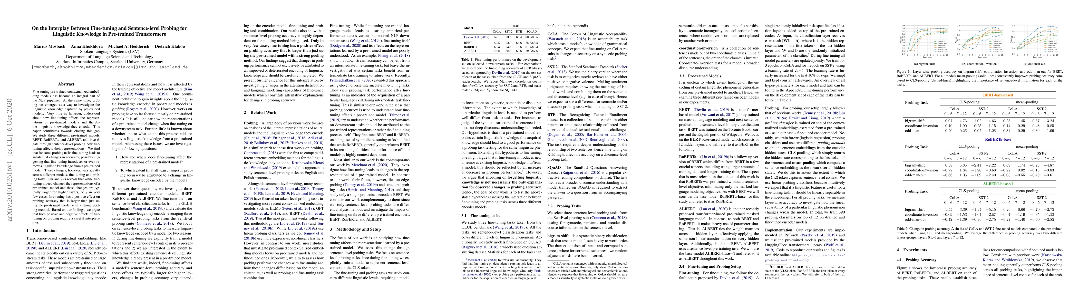 This paper examines how fine-tuning impacts the linguistic knowledge encoded in pre-trained transformer models (BERT, RoBERTa, and ALBERT) through sentence-level probing. It finds that fine-tuning can substantially alter model representations, sometimes introducing or removing linguistic knowledge, but the effects vary widely across different models and tasks, suggesting that fine-tuning's impact on probing accuracy must be carefully interpreted.