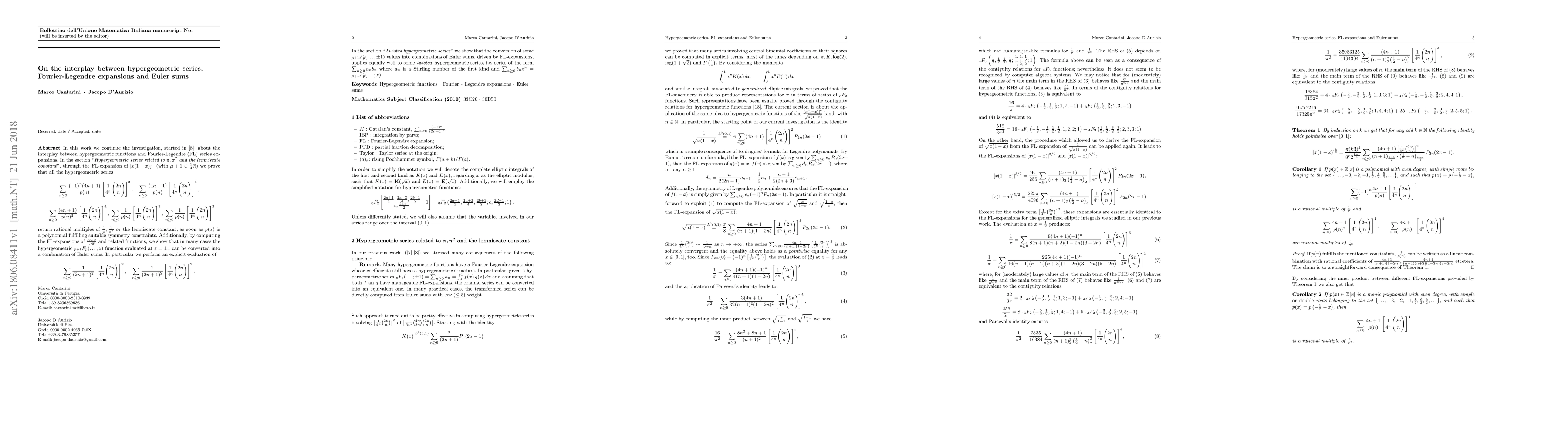 In this work we continue the investigation about the interplay between hypergeometric functions and Fourier-Legendre ($\textrm{FL}$) series expansions. In the section "Hypergeometric series related to $\pi,\pi^2$ and the lemniscate constant", through the FL-expansion of $\left[x(1-x)\right]^\mu$ (with $\mu+1\in\frac{1}{4}\mathbb{N}$) we prove that all the hypergeometric series $$ \sum_{n\geq 0}\frac{(-1)^n(4n+1)}{p(n)}\left[\frac{1}{4^n}\binom{2n}{n}\right]^3,\quad \sum_{n\geq 0}\frac{(4n+1)}{p(n)}\left[\frac{1}{4^n}\binom{2n}{n}\right]^4,$$ $$\quad \sum_{n\geq 0}\frac{(4n+1)}{p(n)^2}\left[\frac{1}{4^n}\binom{2n}{n}\right]^4,\; \sum_{n\geq 0}\frac{1}{p(n)}\left[\frac{1}{4^n}\binom{2n}{n}\right]^3,\; \sum_{n\geq 0}\frac{1}{p(n)}\left[\frac{1}{4^n}\binom{2n}{n}\right]^2 $$ return rational multiples of $\frac{1}{\pi},\frac{1}{\pi^2}$ or the lemniscate constant, as soon as $p(x)$ is a polynomial fulfilling suitable symmetry constraints. Additionally, by computing the FL-expansions of $\frac{\log x}{\sqrt{x}}$ and related functions, we show that in many cases the hypergeometric $\phantom{}_{p+1} F_{p}(\ldots , z)$ function evaluated at $z=\pm 1$ can be converted into a combination of Euler sums. In particular we perform an explicit evaluation of $$ \sum_{n\geq 0}\frac{1}{(2n+1)^2}\left[\frac{1}{4^n}\binom{2n}{n}\right]^2,\quad \sum_{n\geq 0}\frac{1}{(2n+1)^3}\left[\frac{1}{4^n}\binom{2n}{n}\right]^2. $$ In the section "Twisted hypergeometric series" we show that the conversion of some $\phantom{}_{p+1} F_{p}(\ldots,\pm 1)$ values into combinations of Euler sums, driven by FL-expansions, applies equally well to some twisted hypergeometric series, i.e. series of the form $\sum_{n\geq 0} a_n b_n$ where $a_n$ is a Stirling number of the first kind and $\sum_{n\geq 0}b_n z^n = \phantom{}_{p+1} F_{p}(\ldots;z)$.