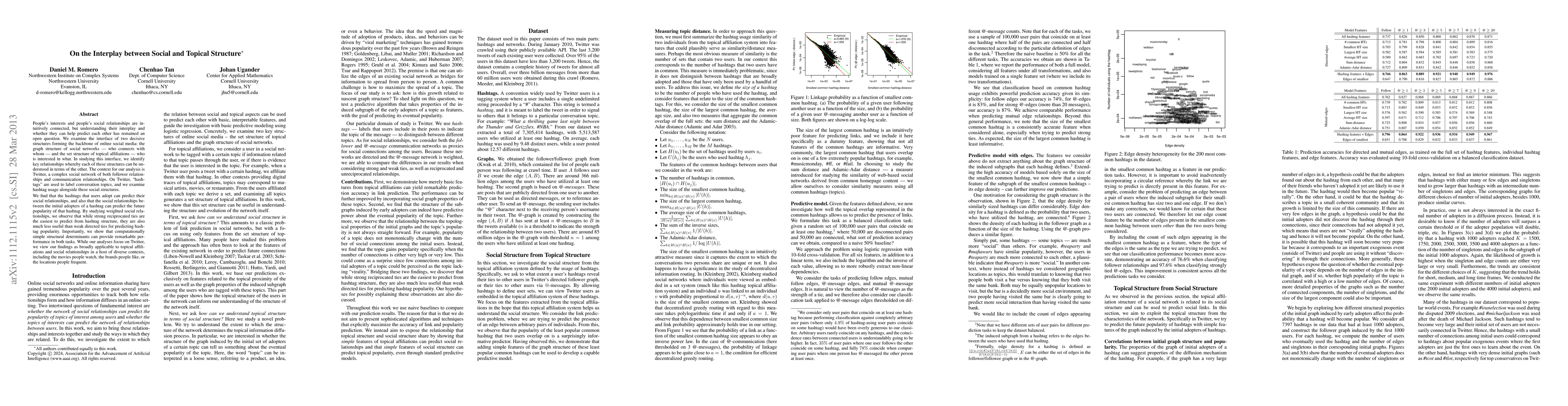This paper explores the relationship between social network structures and topical affiliations on Twitter, finding that hashtag usage can predict social relationships and vice versa. It highlights that while strong ties are easier to predict from hashtag use, weak ties are more effective for predicting hashtag popularity.
