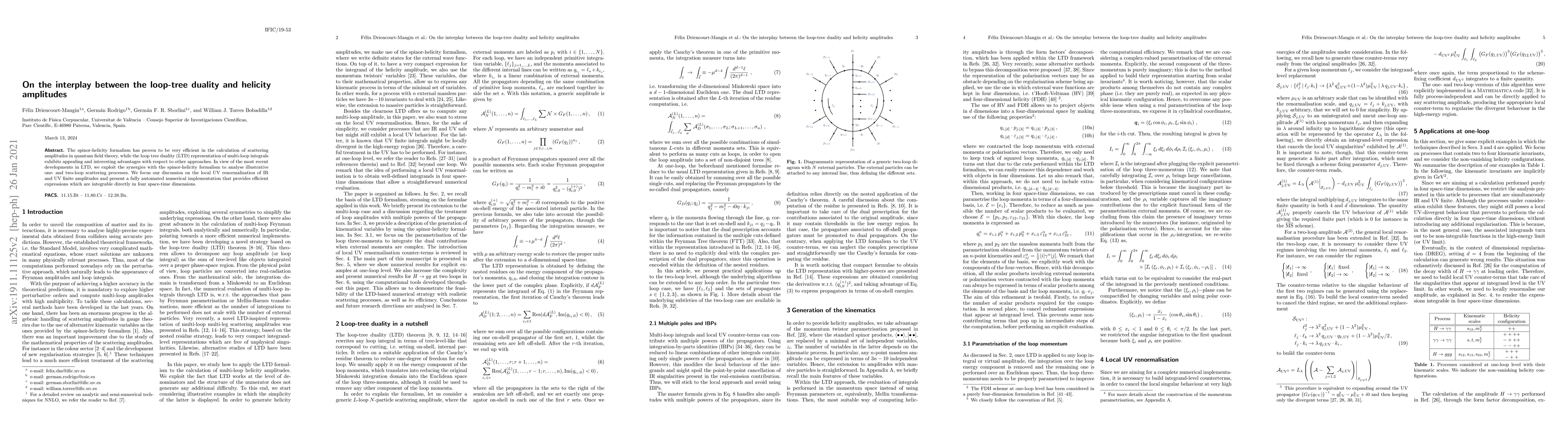 This paper explores the synergy between the loop-tree duality (LTD) and the spinor-helicity formalism to efficiently calculate scattering amplitudes in quantum field theory, focusing on one- and two-loop processes. It presents a fully automated numerical implementation for local UV renormalization of IR and UV finite amplitudes.