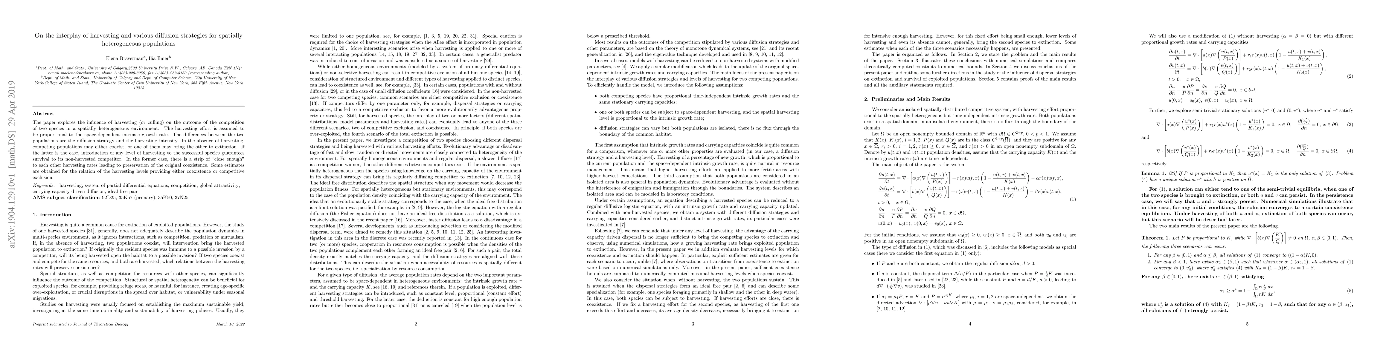 This paper investigates how harvesting affects the competition between two species in a spatially heterogeneous environment, focusing on the role of diffusion strategies and varying harvesting intensities. It finds that harvesting can either ensure the survival of the less competitive species or disrupt the coexistence of both, depending on the specific harvesting rates.